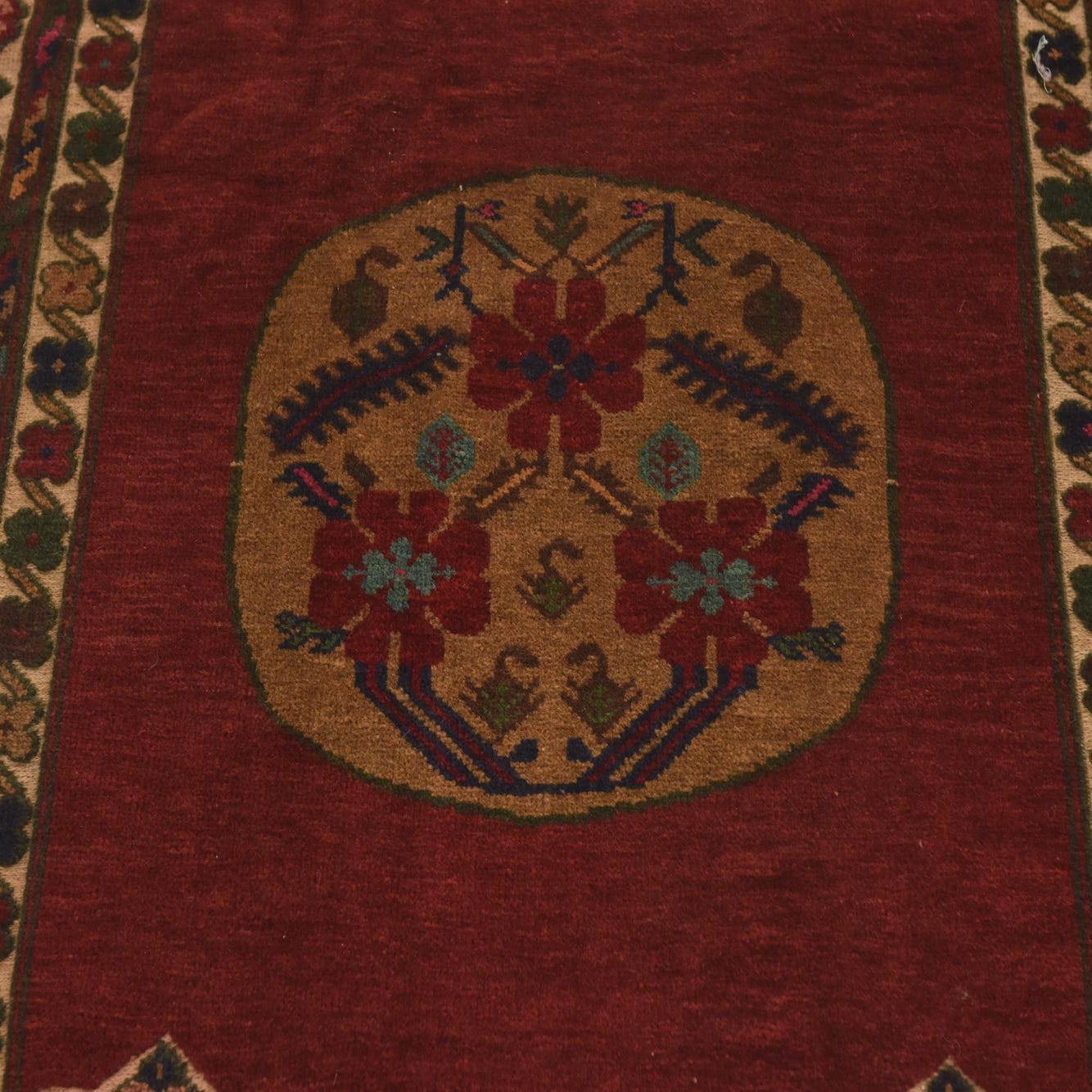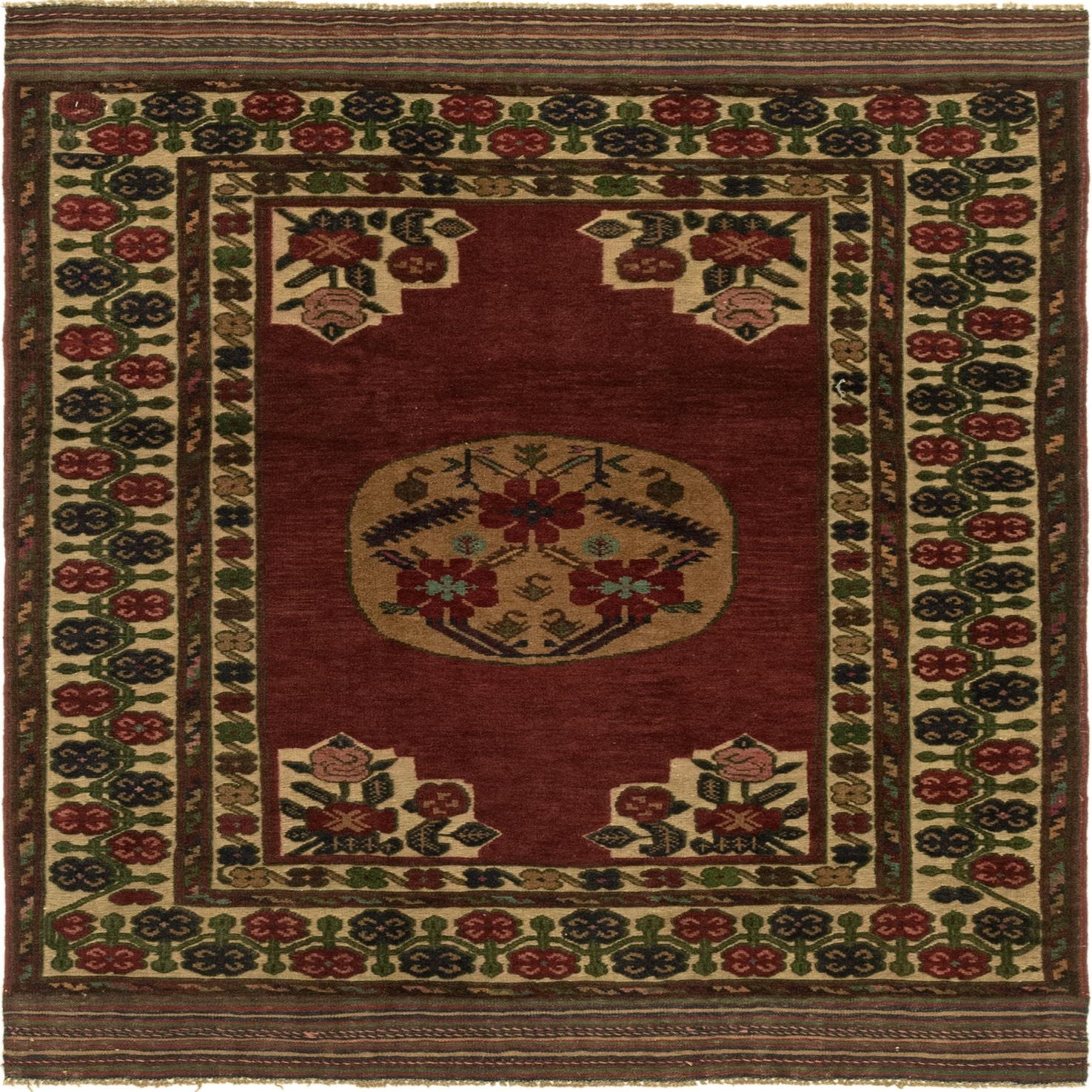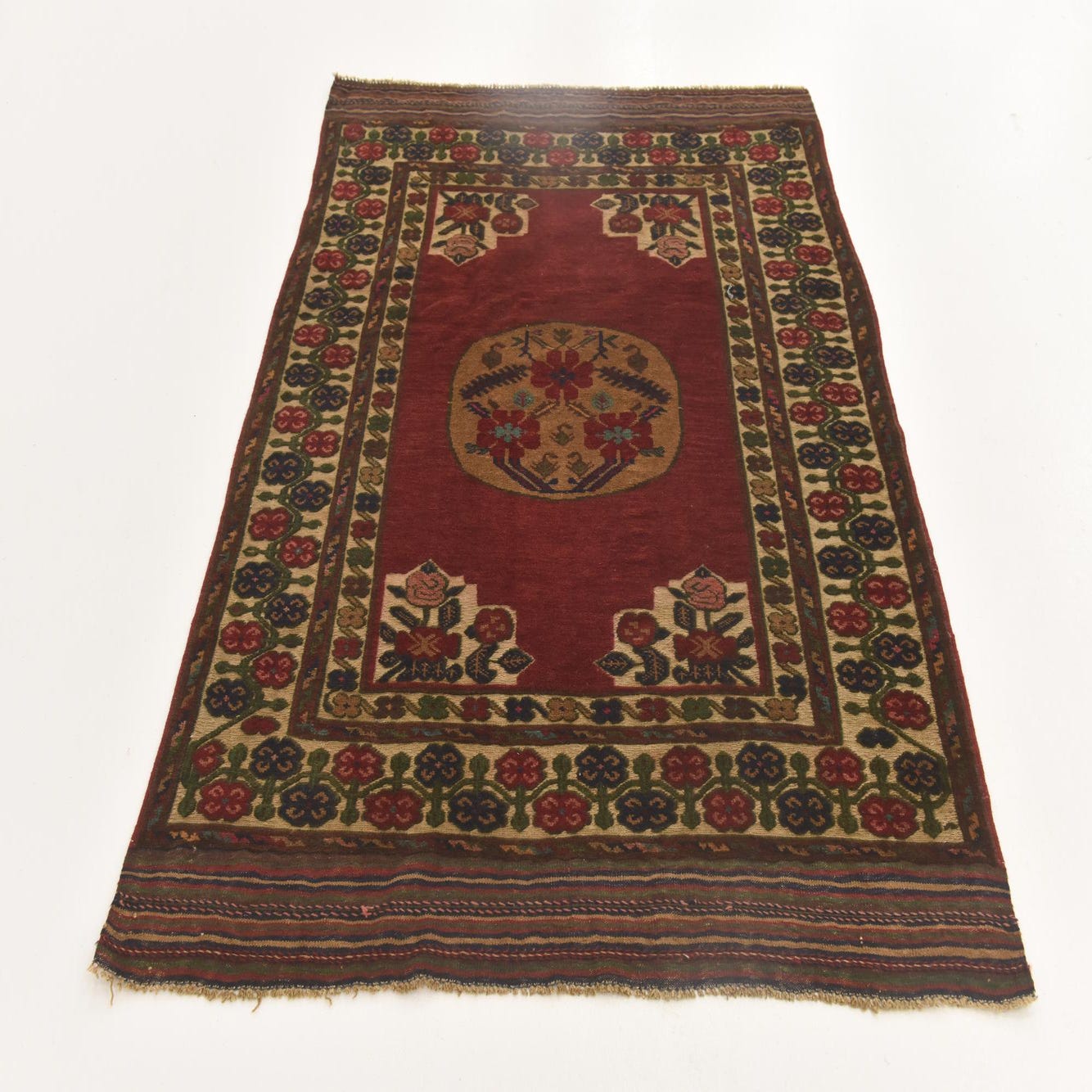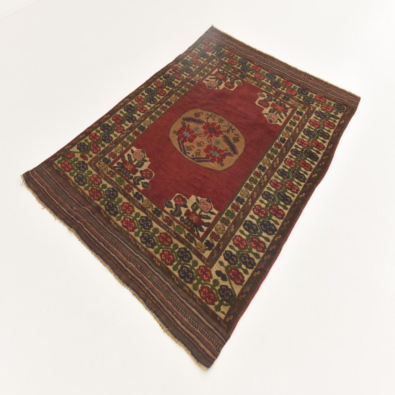 A 4x6 rectangular red wool rug with a traditional botanical medallion pattern and tribal border, ideal for a living room.
