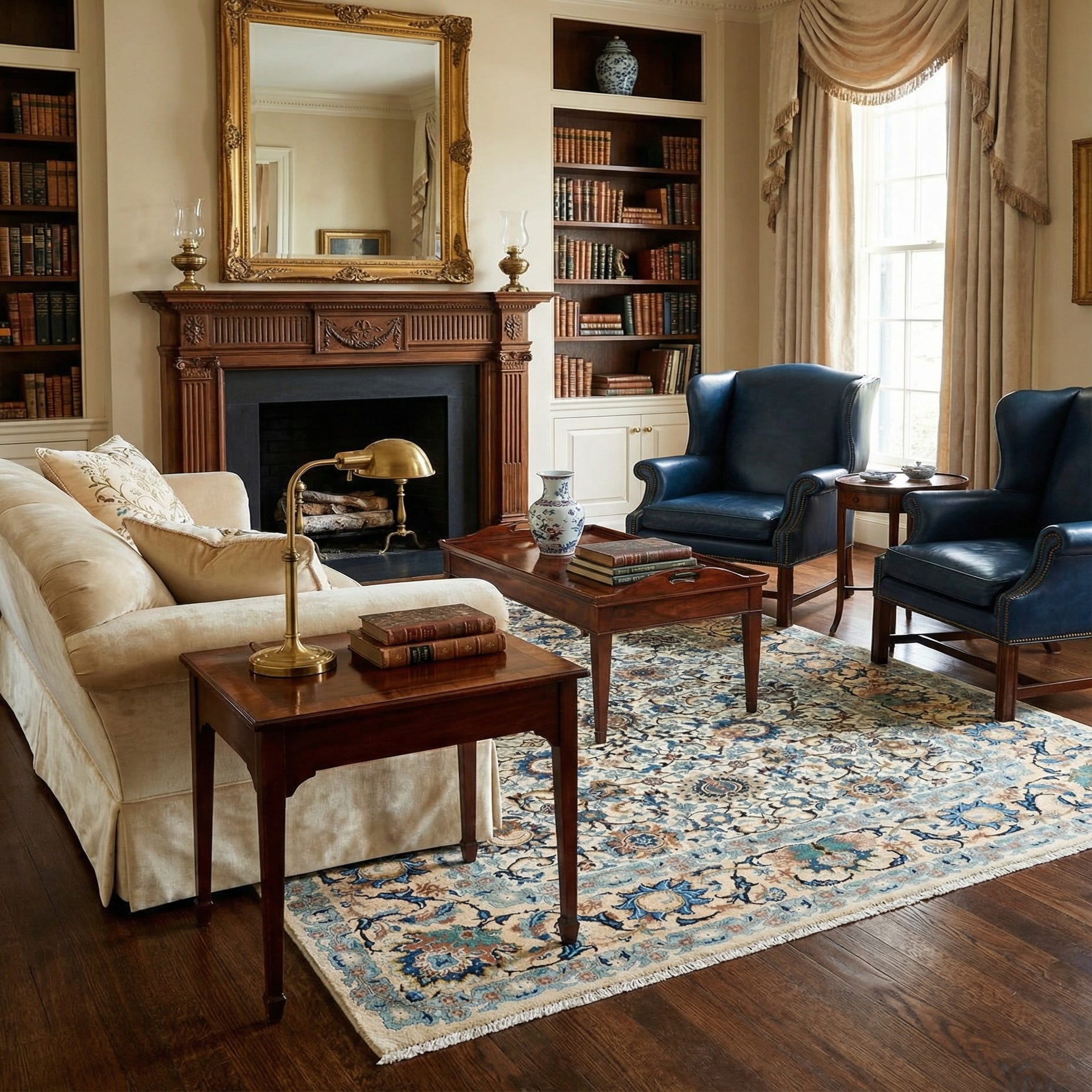 Hand Made of Wool, the surface has a soft, slightly plush hand with a firm weave you can feel beneath your feet. It pairs especially well with warm wood tones and leather seating for a classic living area, or with crisp neutral upholstery and blue accents for a transitional look. The rug also complements a cozy bedroom or an entry with layered textiles, and it can anchor an eclectic space where pattern and color are used as design focal points.
