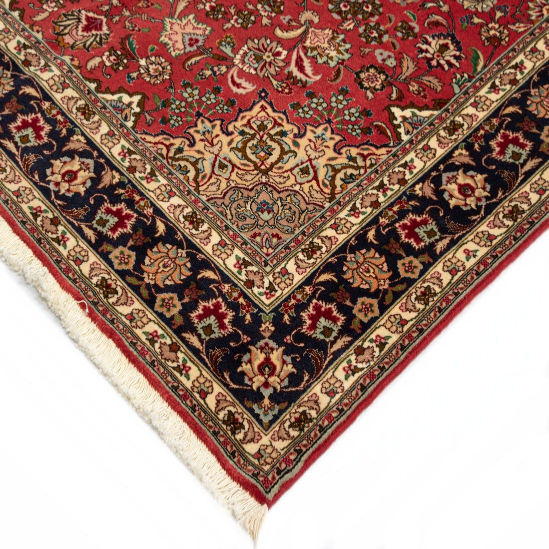 A classic Persian medallion layout anchors a dense field of scrolling floral motifs and meandering vines on a warm red ground. The central medallion and corner spandrels are rendered in deep navy and beige with finely detailed accents in brown, green and blue, while a series of ivory guard borders and a darker main border frame the composition. The pattern reads formal and balanced, with small-scale floral fills that create visual texture across the surface.