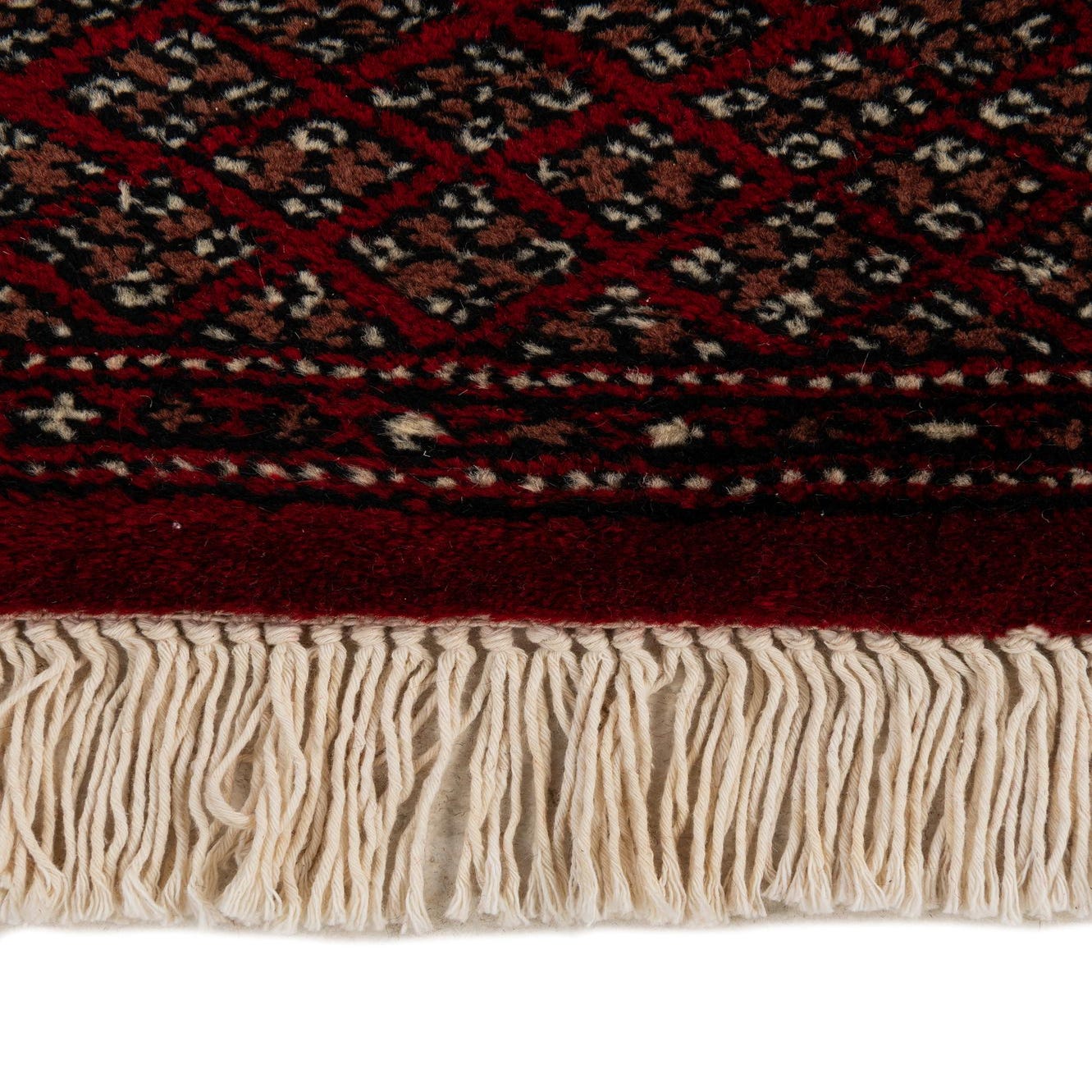 A 4x6 rectangular Torkaman rug in deep red with intricate traditional Persian patterns and cream fringe.