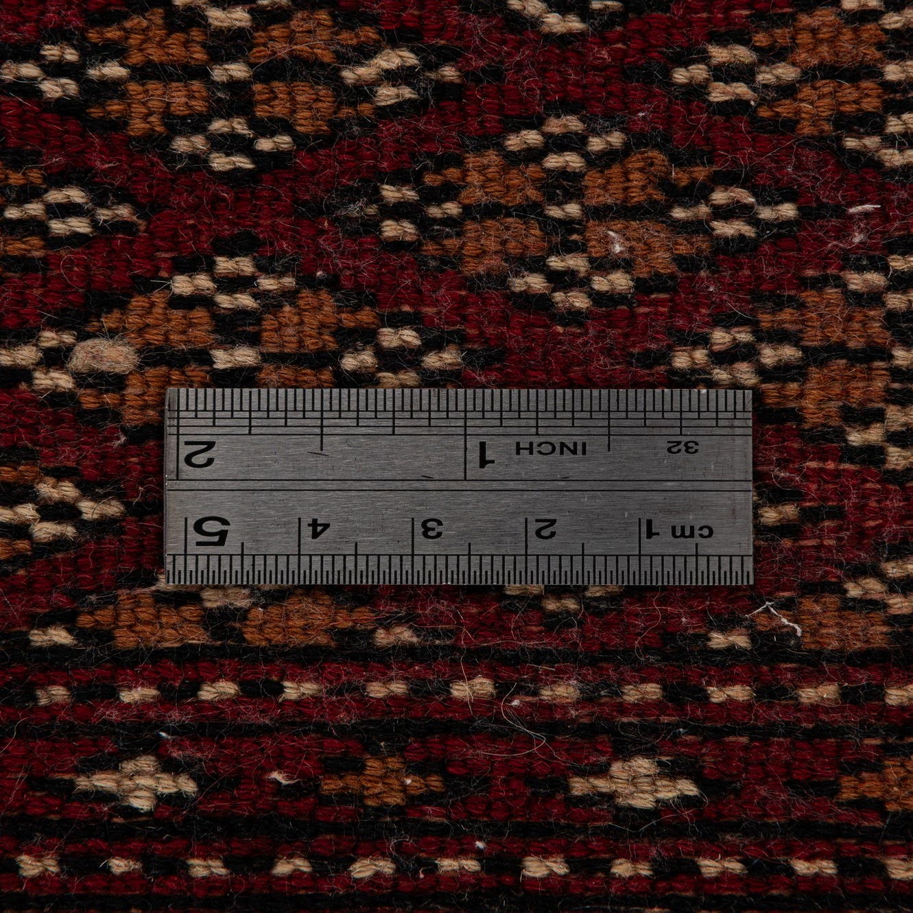 Primary color is Red. Colors in this rug include: Red, Black, Brown, Ivory.
