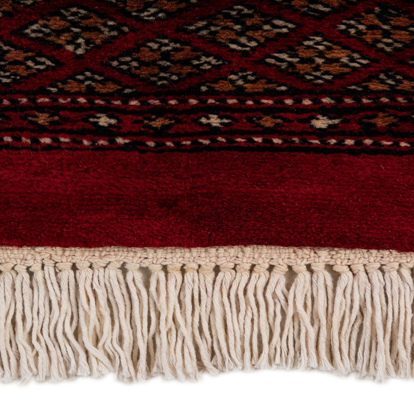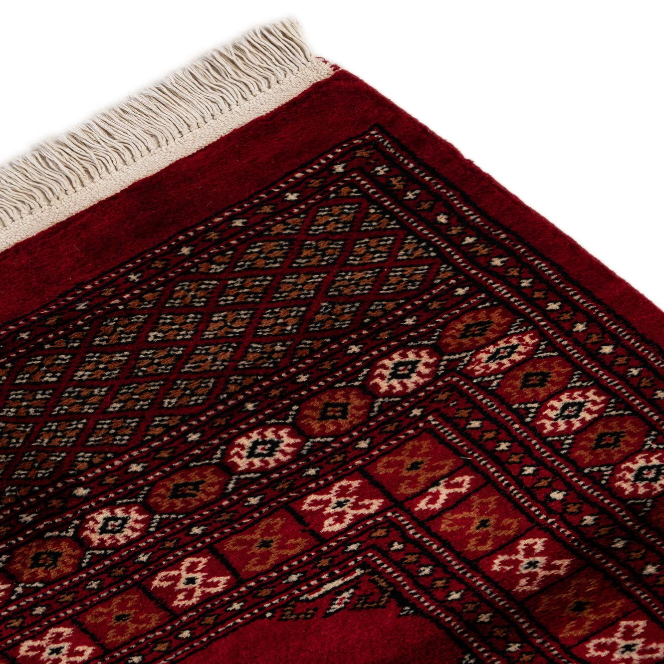 A 4x6 rectangular Torkaman rug in deep red with traditional Oriental patterns and white fringe.