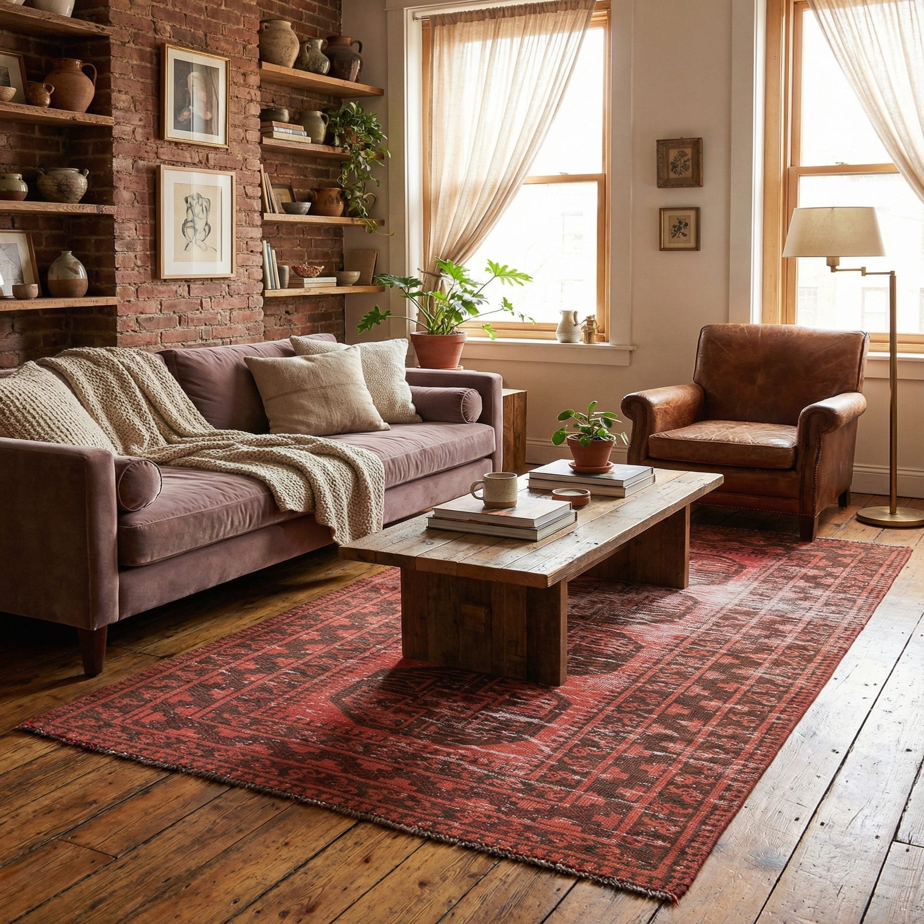 The low, dense wool pile feels tactile and grounded underfoot, offering a soft yet structured surface. The red-and-brown palette pairs naturally with warm wood tones, leather seating, or neutral upholstery; use it to anchor an entryway or foyer, layer it beneath a compact seating arrangement in a living room, or place it at the foot of a bed to add color and pattern to a bedroom. Its vintage aesthetic fits comfortably in eclectic, mid-century, or rustic interiors that welcome a piece with character.