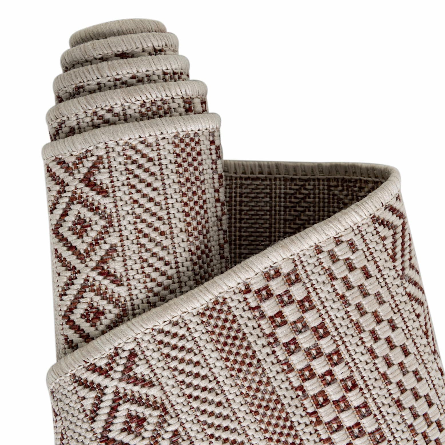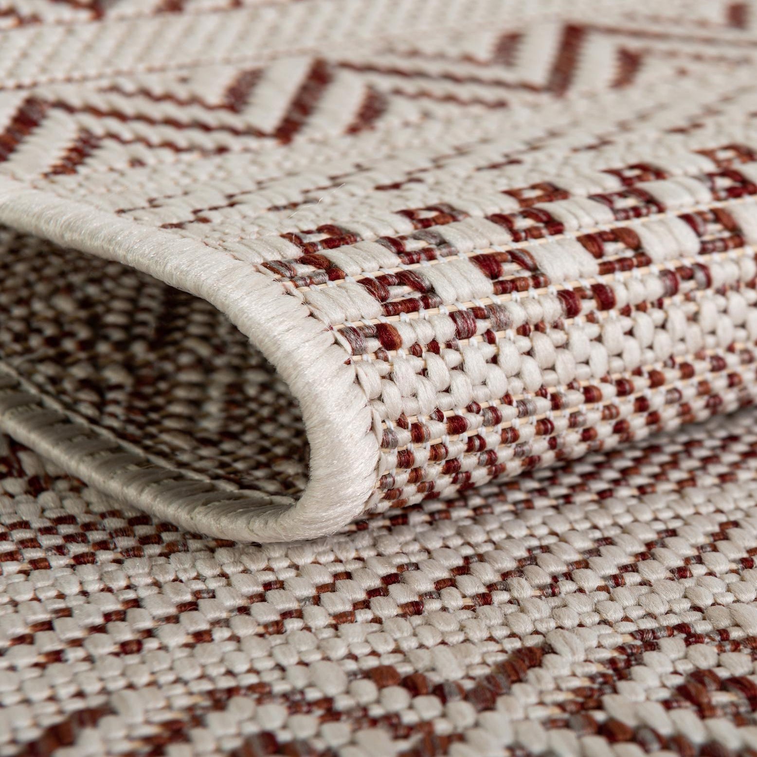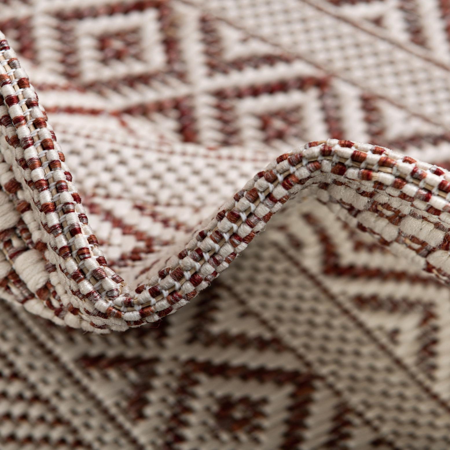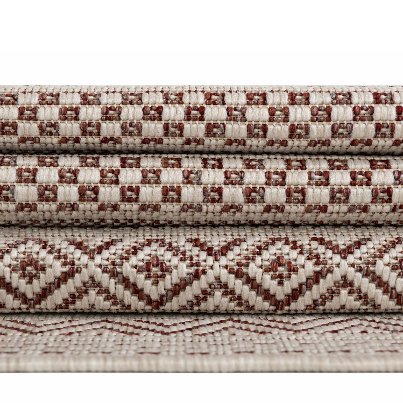 This flatweave rug showcases a series of intricate geometric patterns, forming borders that create pleasing symmetry and visual interest. The tightly woven fibers result in a flat and smooth texture, ideal for high-traffic areas and active outdoor spaces.