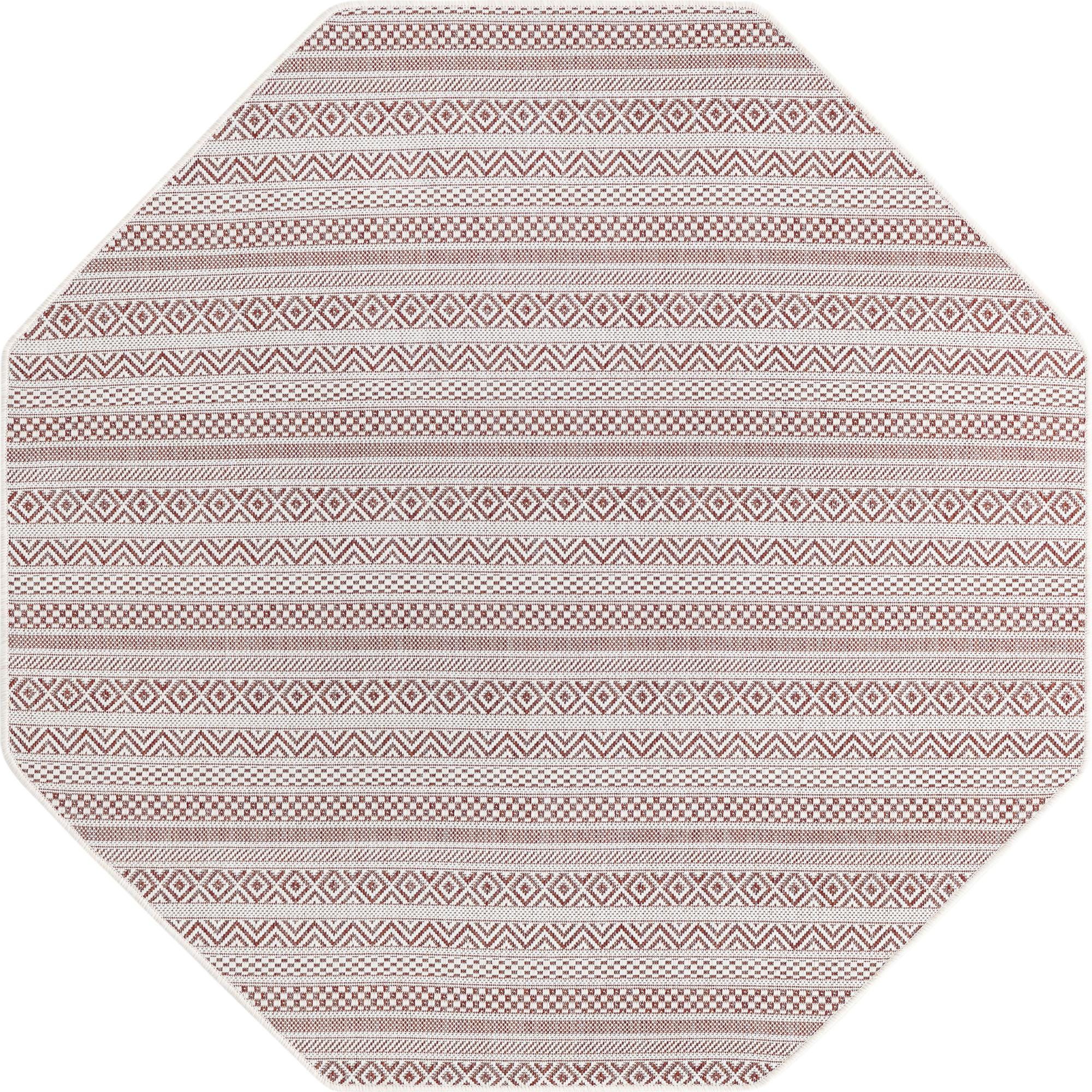 The Outdoor Ribbon collection offers a dynamic addition to any outdoor or casual living space with its 5 Ft Octagon rug. Machine woven of 100% polypropylene, this piece is designed to withstand the elements while maintaining a robust red and ivory color palette. The background is a vibrant red, contrasted with a detailed ivory pattern that draws inspiration from traditional motifs, delivering a timeless aesthetic.