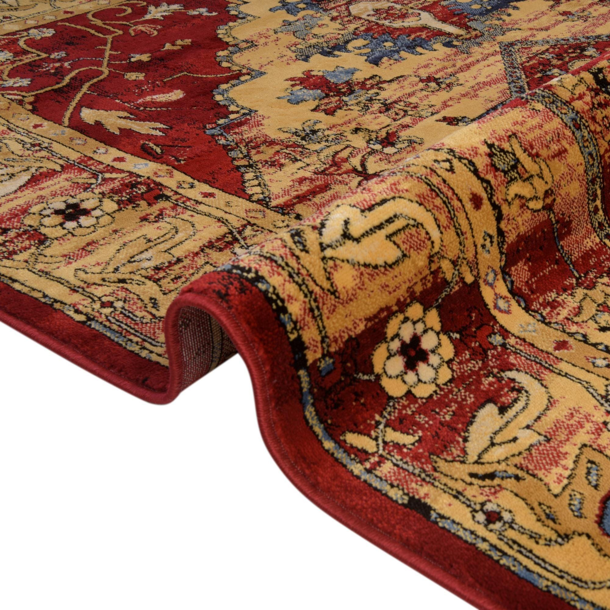 A classic round medallion rug with clear traditional influence, this piece pairs a deep red field with a warm beige and ivory central medallion, accented by touches of blue and black throughout the design. The pattern combines stepped geometric forms and delicate floral vines, finished with a detailed outer border that frames the composition. Machine made from 100% polypropylene, the rug has a low, slightly plush pile that feels soft underfoot and shows a subtle, refined sheen.