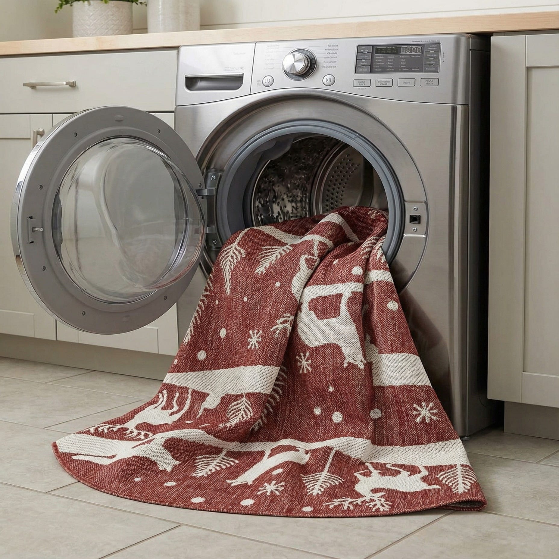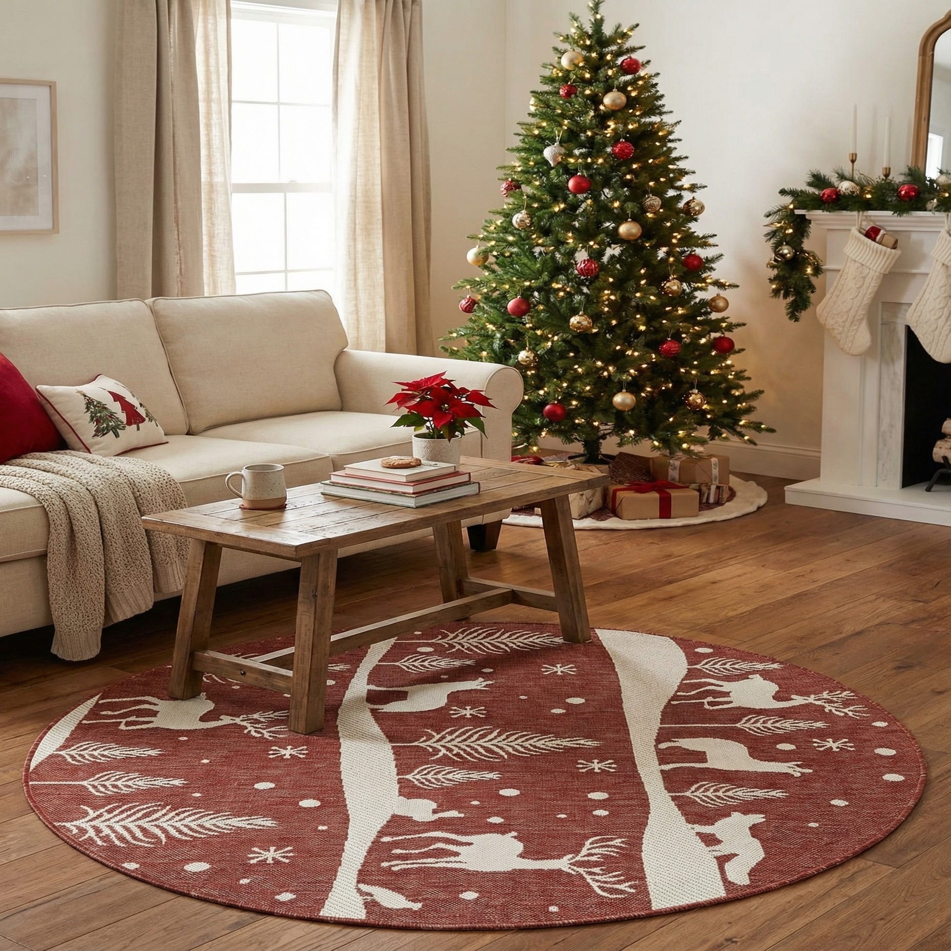 From the Outdoor Holiday Collection, this 5 Ft Round rug presents a charming seasonal design that will enhance the festive spirit of any space. Machine woven with 100% polypropylene, the rug features a robust red background, accented with ivory motifs of reindeer, snowflakes, and fir tree branches, creating a welcoming winter wonderland theme.