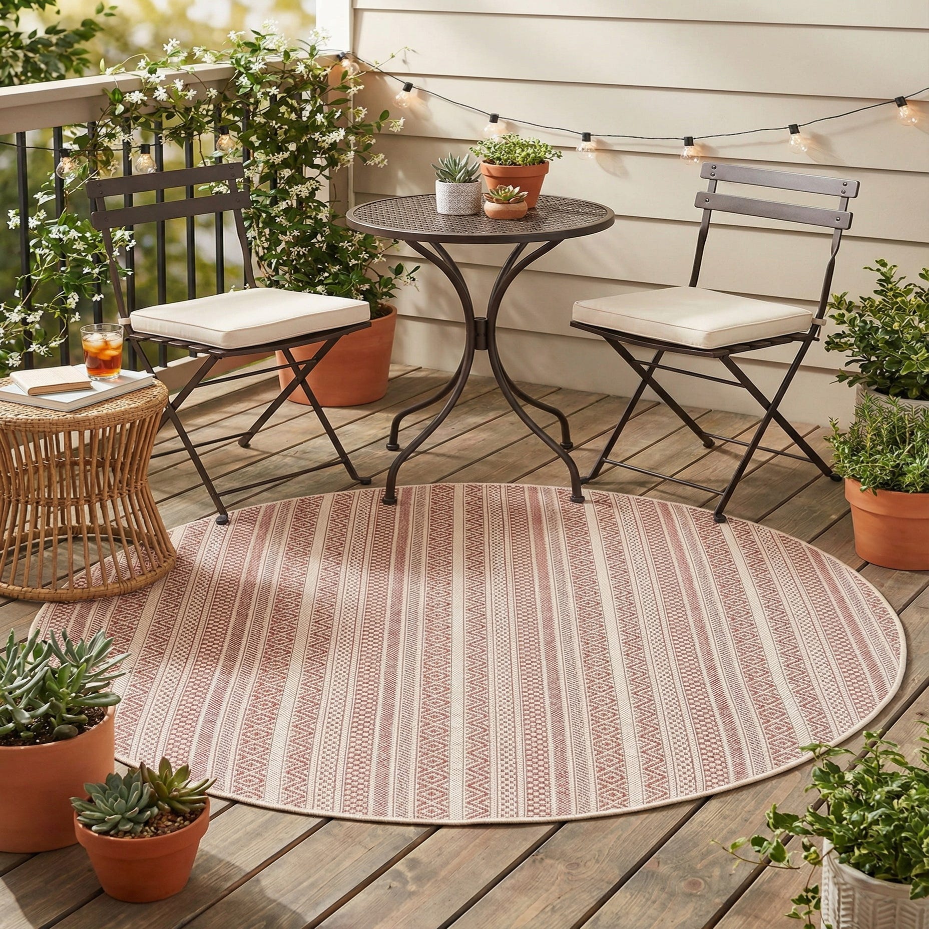 This round rug works well on a covered patio or porch as a grounding layer for a bistro set or seating group, and it can also define a casual dining nook or entry area indoors. Pair it with natural wood and wicker furniture for a coastal or farmhouse feel, use it in a boho outdoor living space with layered textures and patterned cushions, or place it in a modern setting to add a touch of graphic warmth without heavy pile.