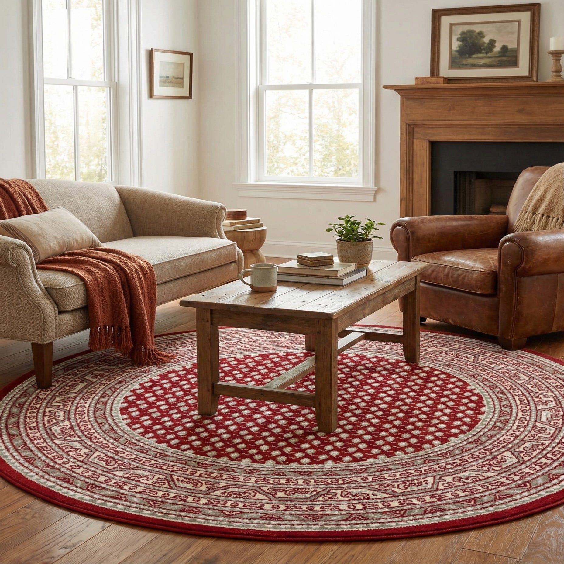 Place this rug to anchor a round dining table or to define a cozy seating nook; its warm red field and neutral accents work as a focal point in both classic and transitional layouts. It pairs well with warm wood furniture, neutral upholstery, or brass and aged-metal finishes, and can also be layered in eclectic or bohemian schemes to add color and pattern without overwhelming the space.