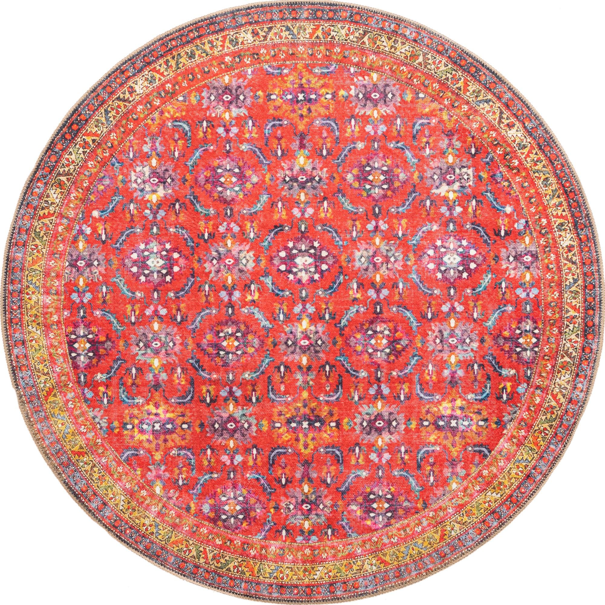 A 5' round red rug with a vibrant traditional floral pattern in blues, purples, and yellows, featuring a detailed border.