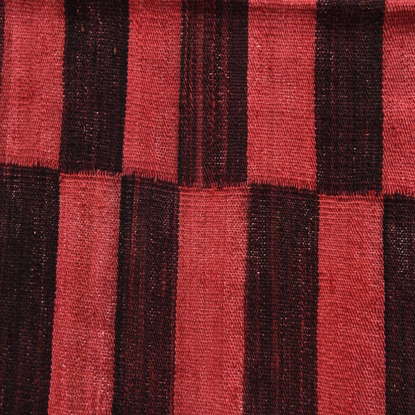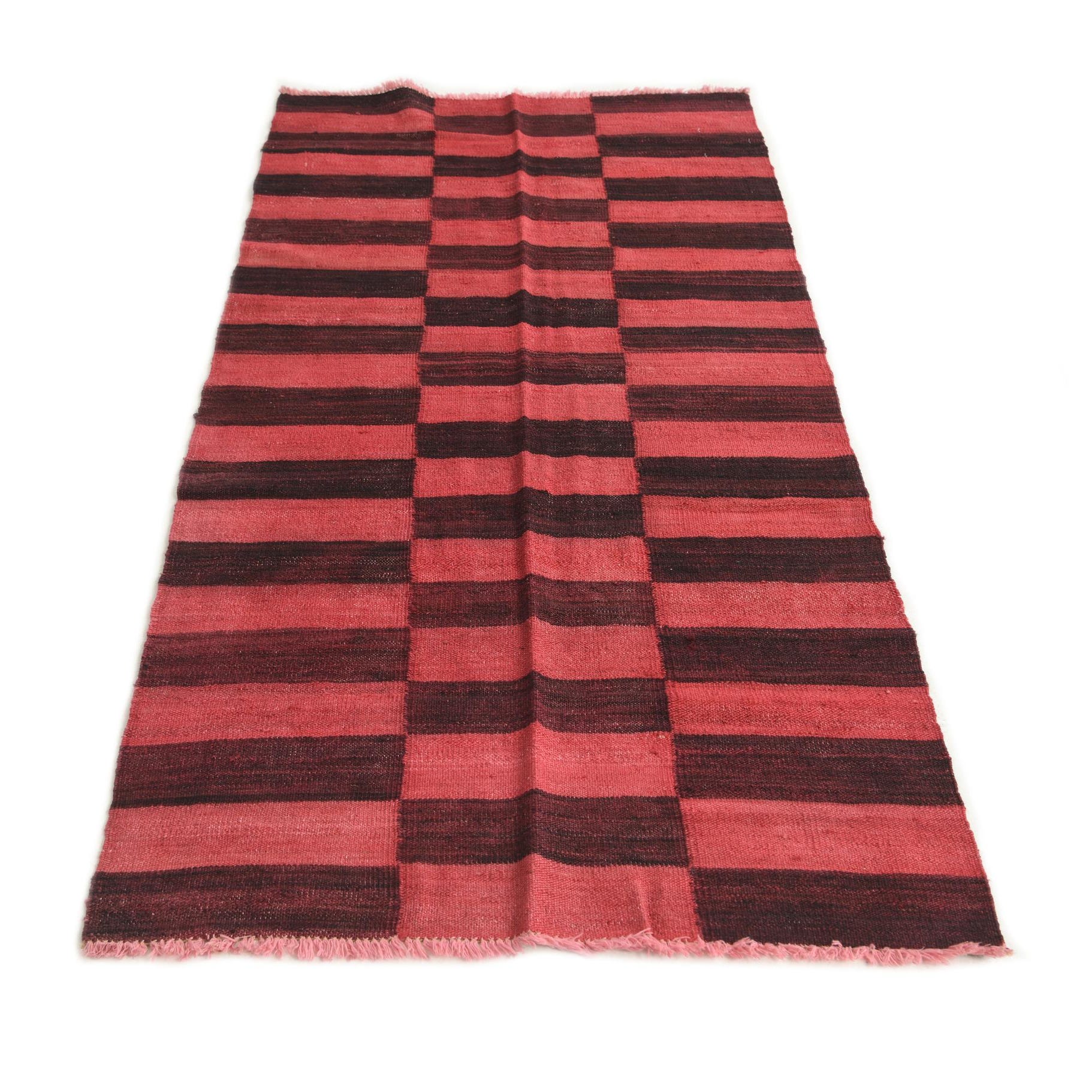 A 5 ft runner rug with a tribal, modern pattern featuring alternating horizontal stripes of red and dark brown.