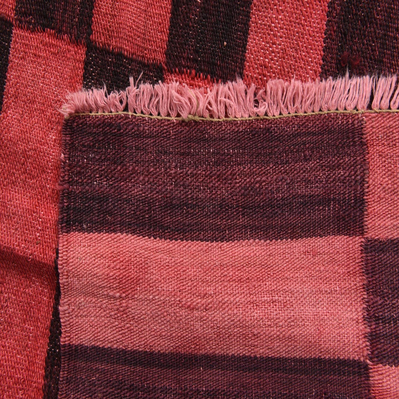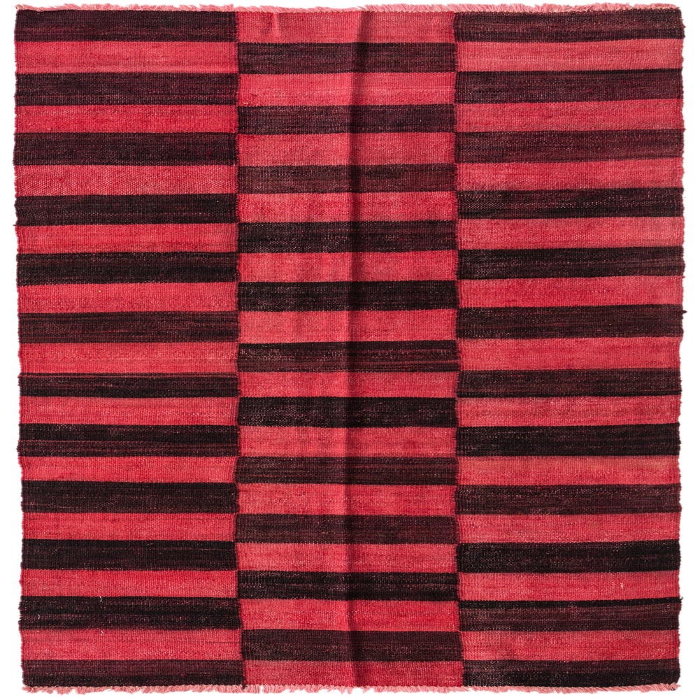 The Kilim Modern Collection presents a 5 Ft Runner, hand-woven from 100% wool, which offers a sturdy yet soft texture underfoot. This runner features a bold and graphic pattern with horizontal bands of red and black, creating a striking contrast that is both dynamic and versatile. The red background anchors the piece with warmth, making it an attractive focal point for a variety of settings.