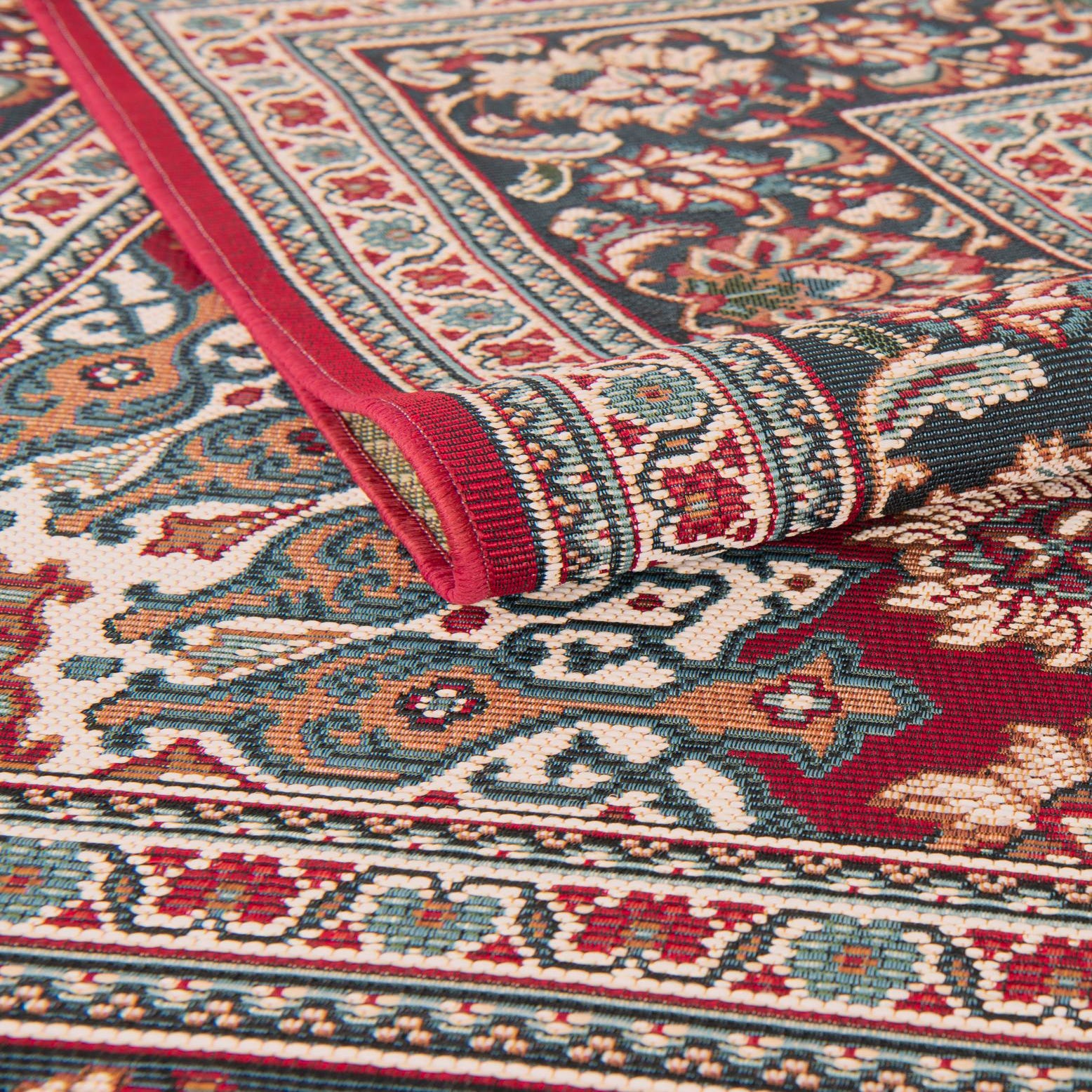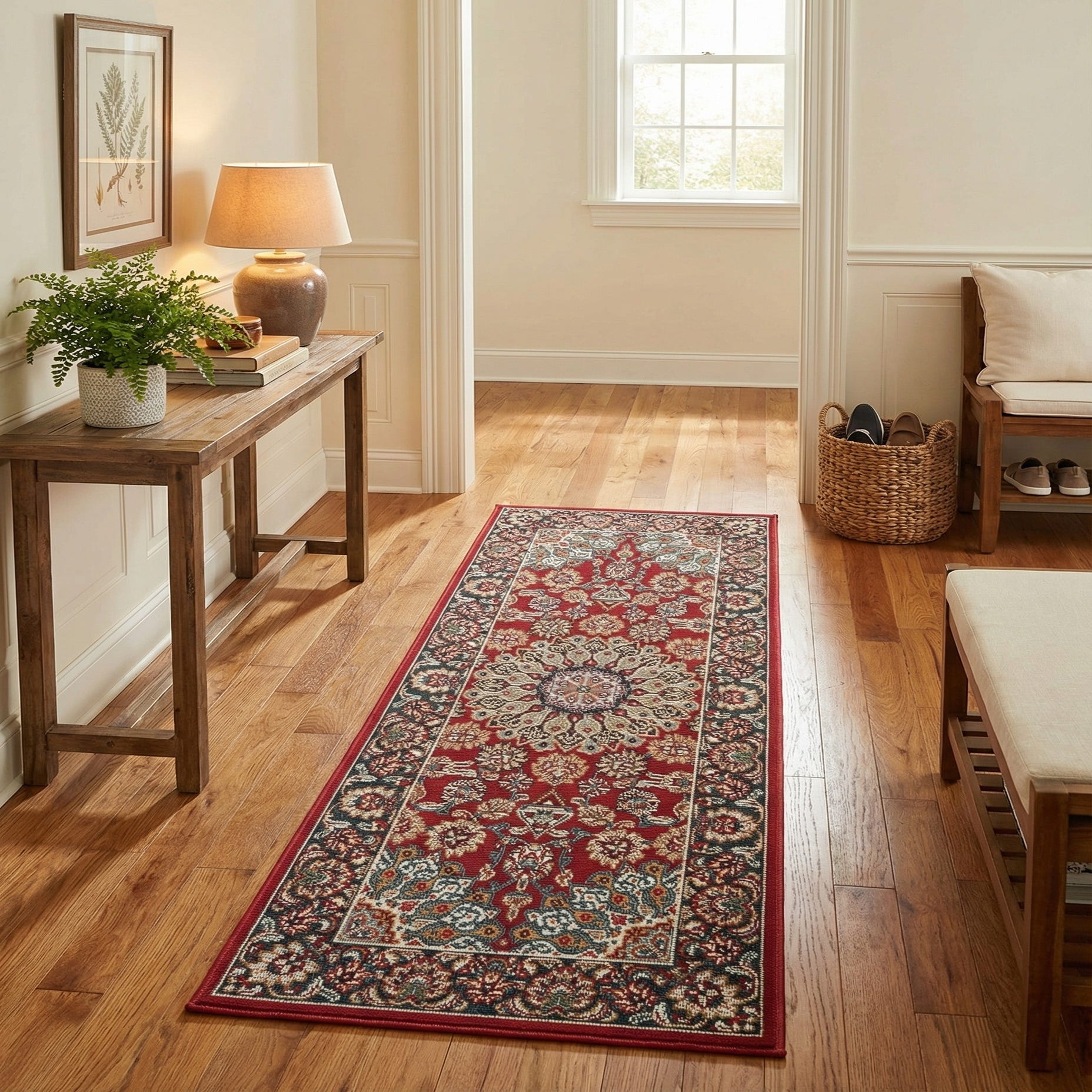 Built for places that need both style and durability, this runner works well in long entryways or narrow hallways to lead the eye and anchor furniture like a console or bench. It also performs nicely on a covered patio or sunroom where a traditional look is desired; pair it with dark wood furnishings and neutral upholstery to balance the saturated red, or layer it over a larger natural-fiber rug to introduce pattern and color to a casual living space. The timeless motif fits traditional and transitional interiors and brings a refined, grounded presence to any corridor or outdoor-living area.