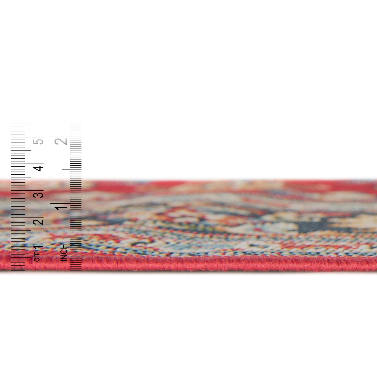 A classic Persian-inspired runner with a rich red background, this rug centers on an ornate medallion framed by scrolling floral vines and a dense floral border. Ivory highlights pick out the delicate motifs while blue and black accents add contrast and depth across the field. Woven from 100% polypropylene, the low, tightly woven pile has a smooth, slightly firm hand that holds the pattern crisply and lays flat underfoot.