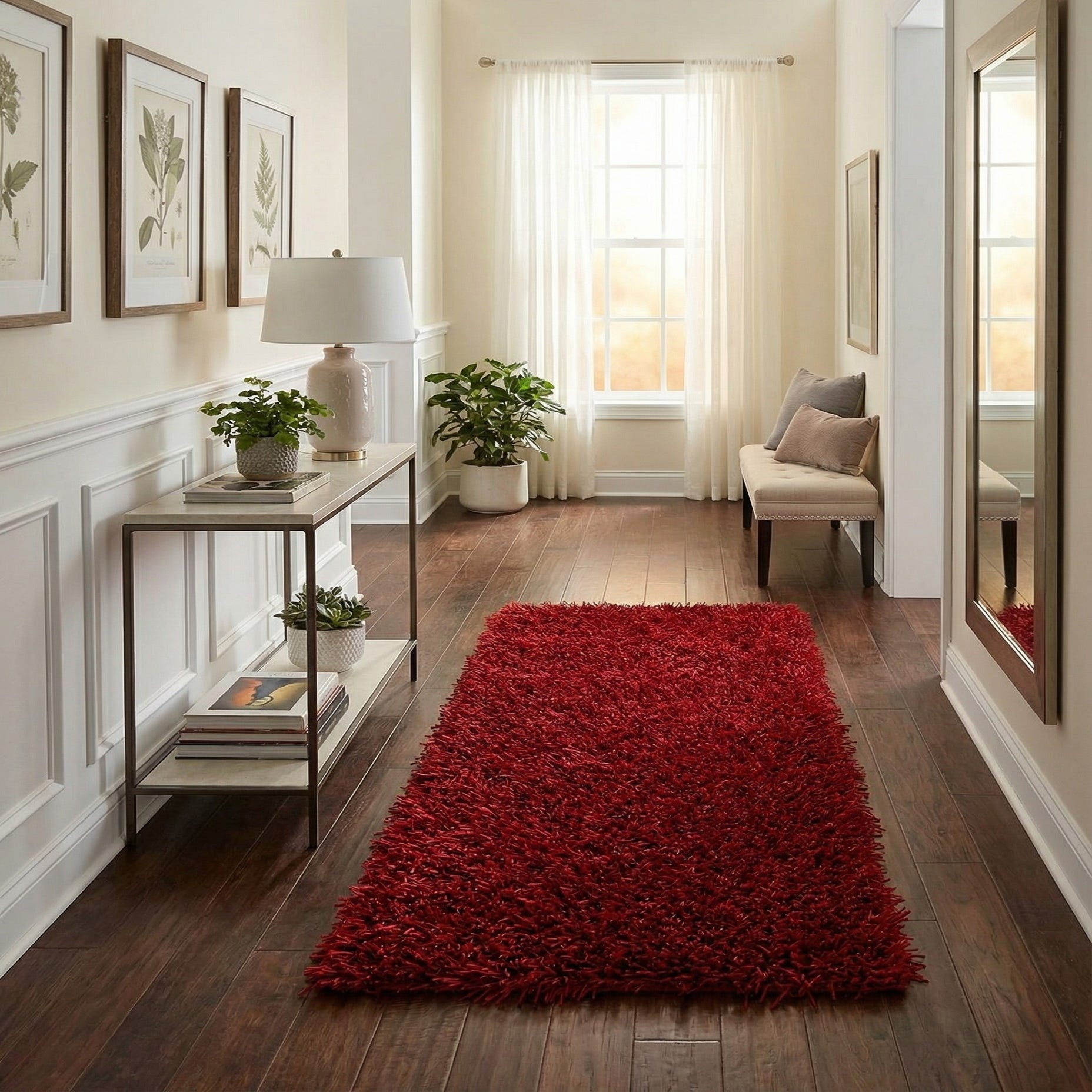 A vibrant red 5 ft runner rug with a plush shag pile, perfect for a modern hallway.