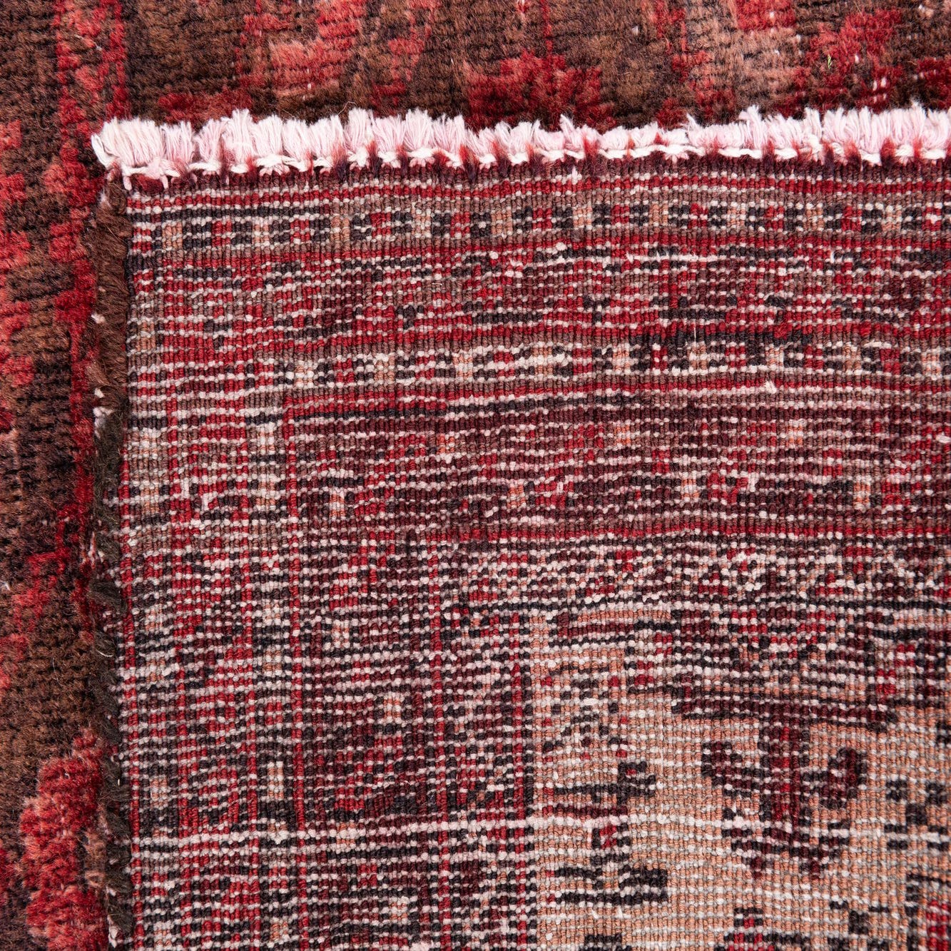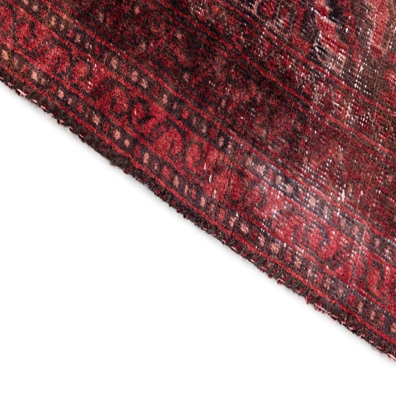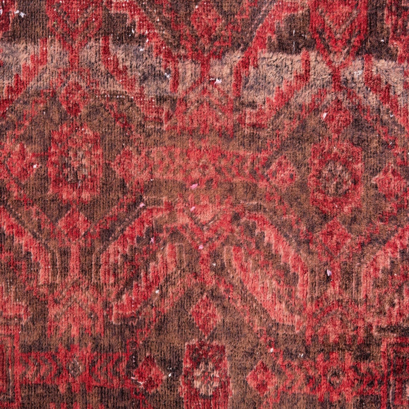 A 5 ft red wool runner rug with a distressed Persian pattern, perfect for a hallway.