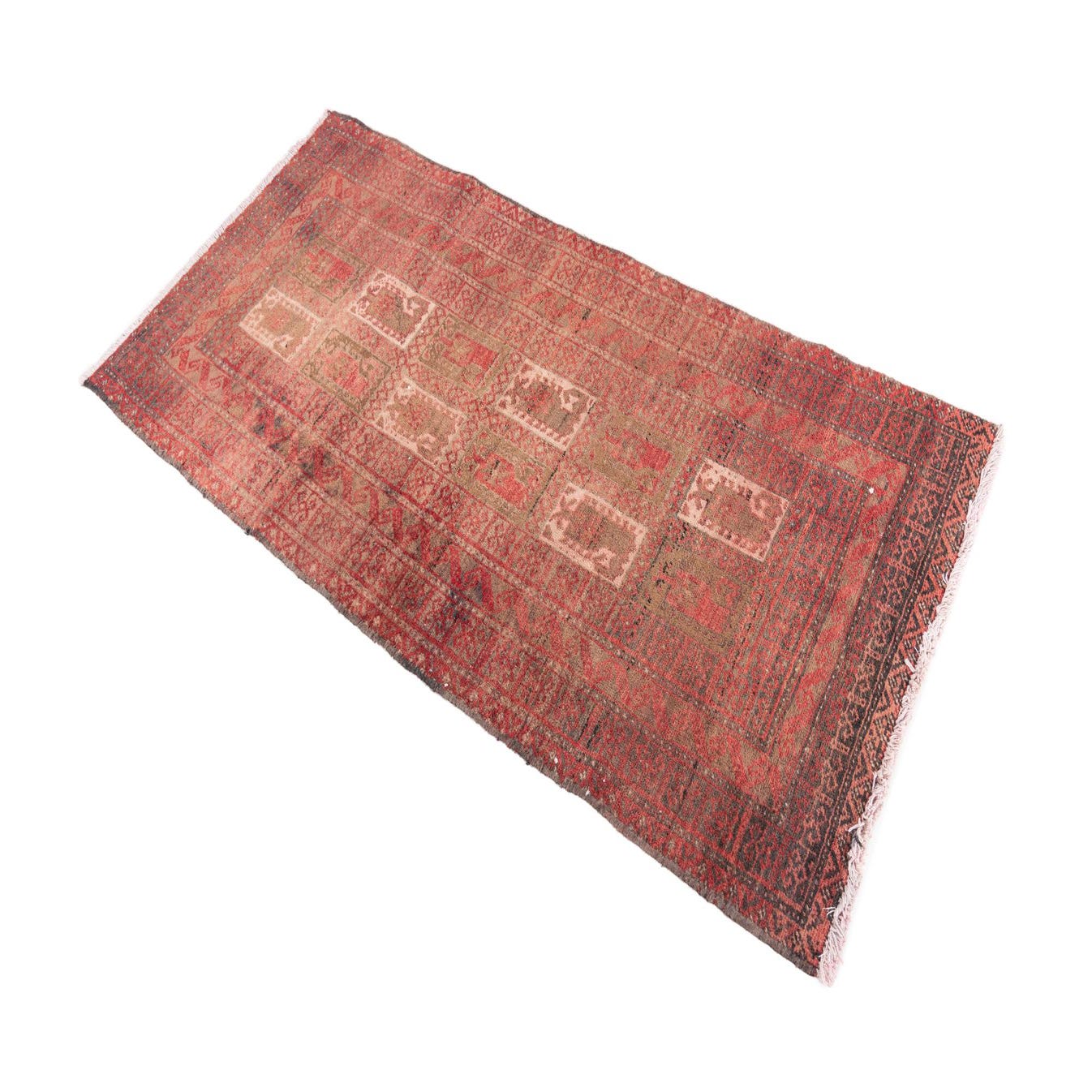 A 5 ft runner rug in shades of red and brown with a distressed Persian-inspired pattern, ideal for a hallway.