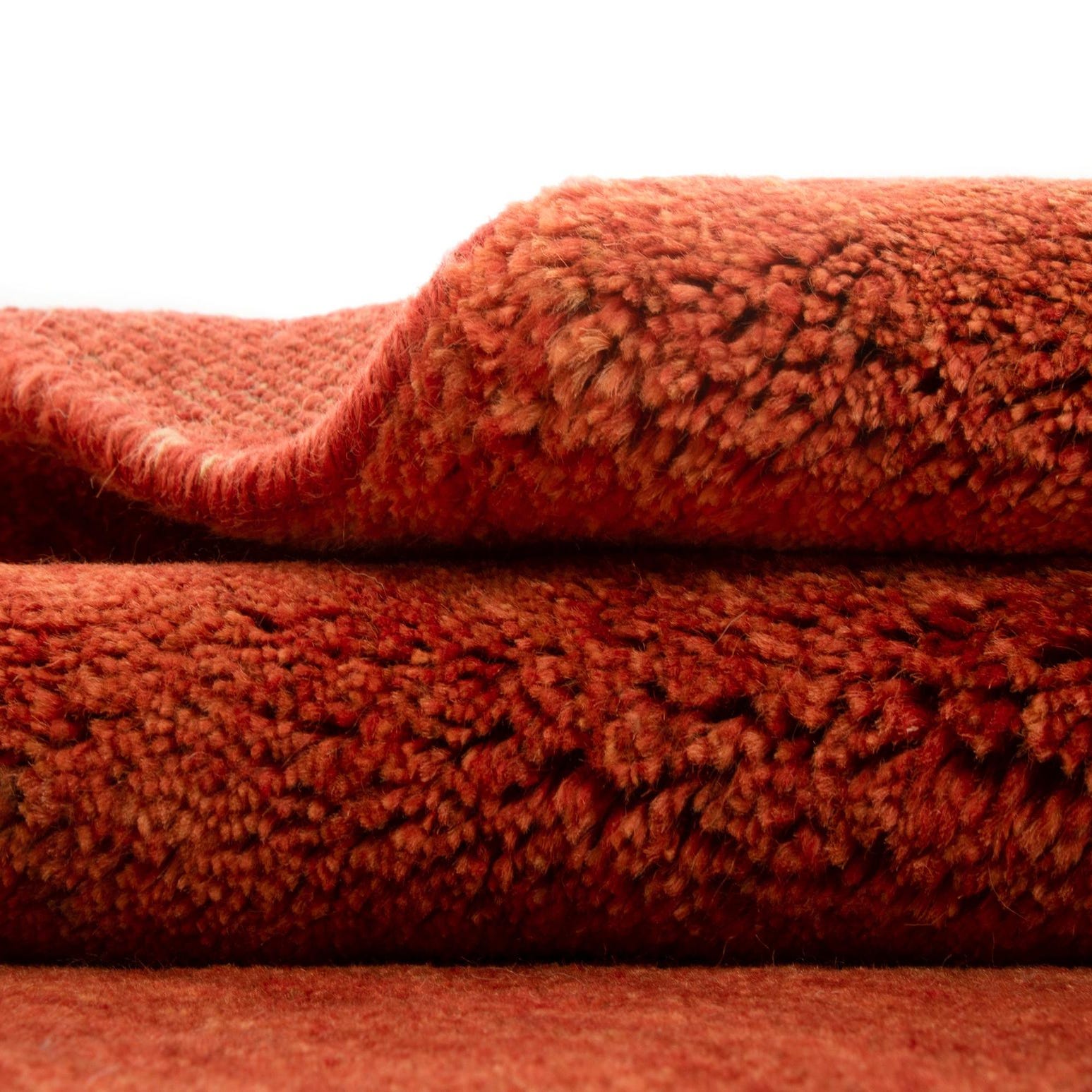 A 4' 7 x 5' 3 square red Gabbeh Shouli wool rug with a subtle, modern Persian design.