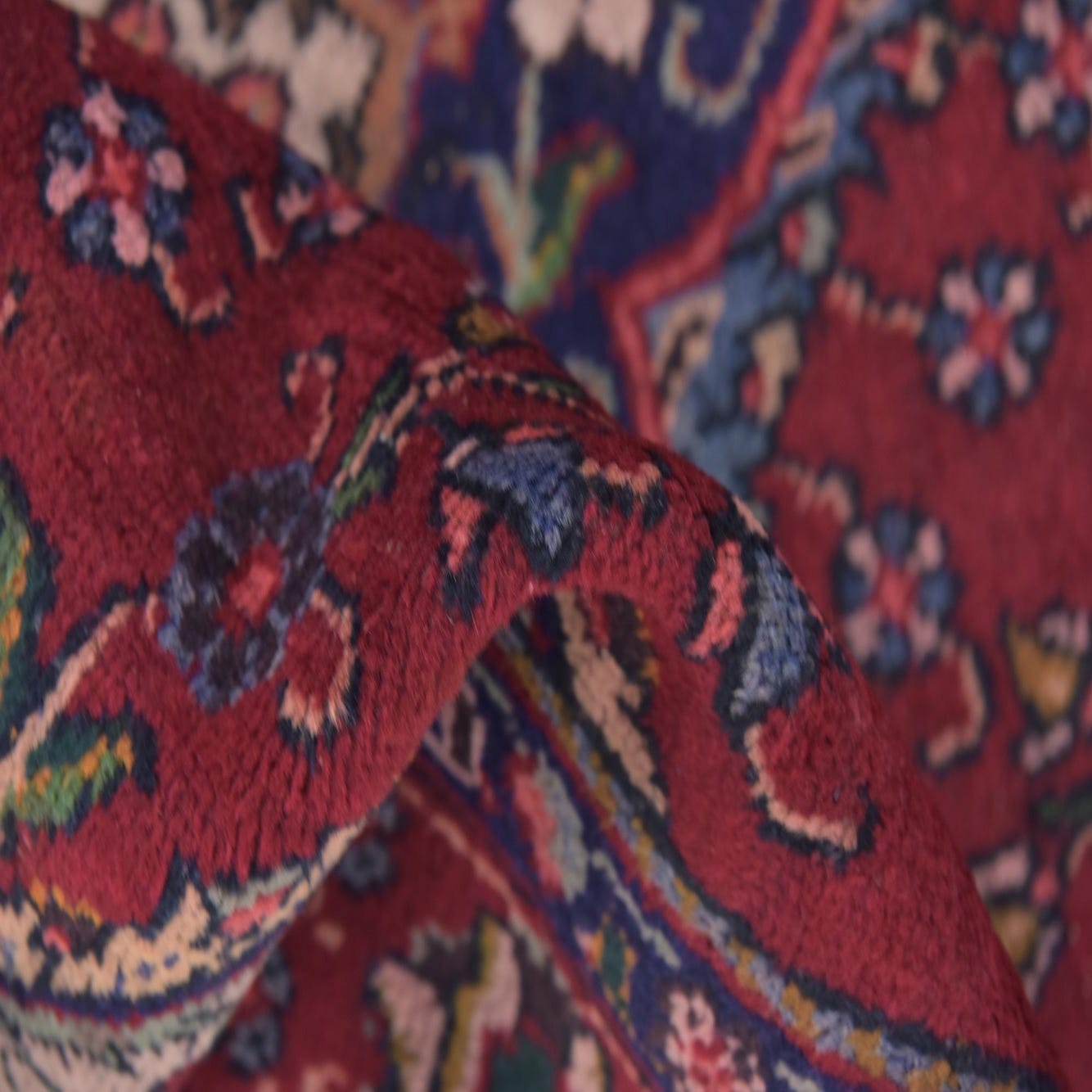 Hand-made from 100% wool, this Persian-inspired rug centers on a bold medallion set against a red background. The design pairs a navy-blue and ivory central motif with delicate floral sprays and vine work in blue, pink, green, beige, brown and black, while ivory corner spandrels and layered borders add contrast and structure. The pattern balances busy floral detail with clear geometric framing, giving the piece a traditional yet versatile character. The tightly woven wool pile feels soft and warm underfoot, with a firm hand that holds its pattern and color definition.