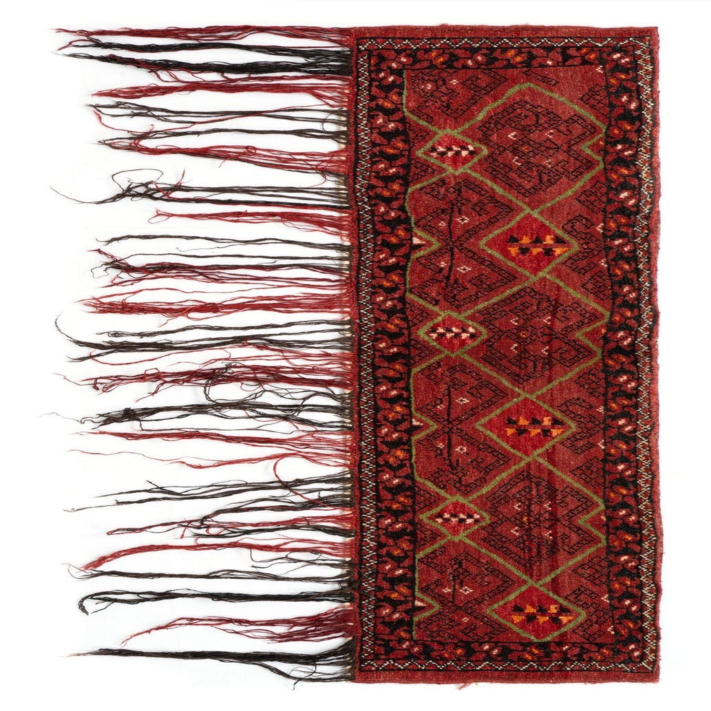 The Afghan collection presents a handcrafted 5-foot table runner made of 100% wool, offering durability and a comfortable underfoot feel. This piece showcases a rich red background, complemented by an interplay of black, green, orange, and beige hues. The traditional pattern is meticulously designed, featuring repeating geometric motifs and border details that evoke the authenticity of Afghan heritage craftsmanship.