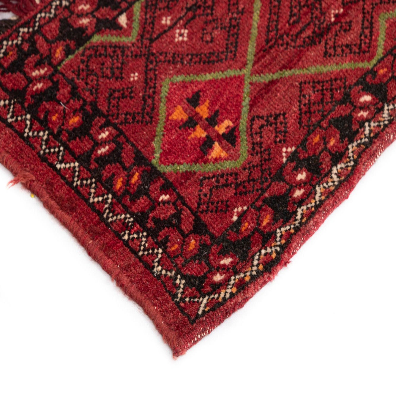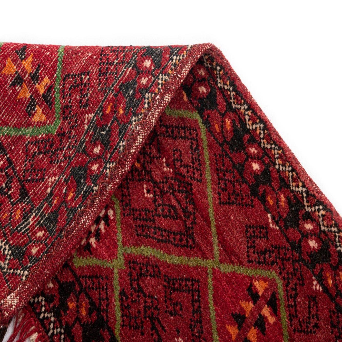 Close-up of a handmade 1' 4 x 5' 3 red wool Persian tribal runner rug with green and black geometric patterns.