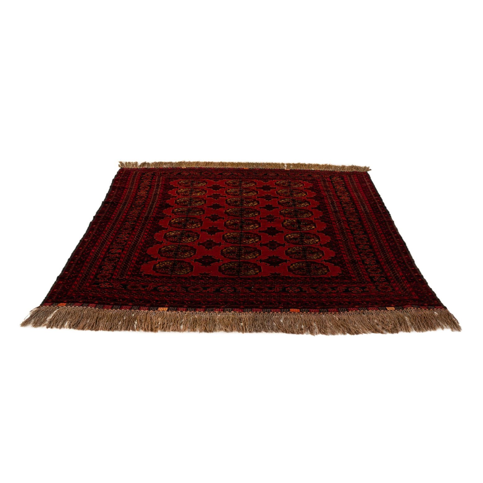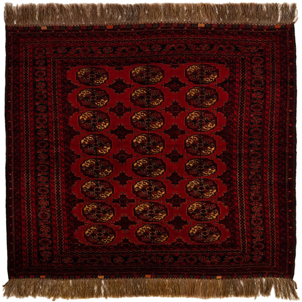 A 5x7 rectangular Afghan Akhche rug featuring a traditional tribal pattern in deep reds and gold with fringe.