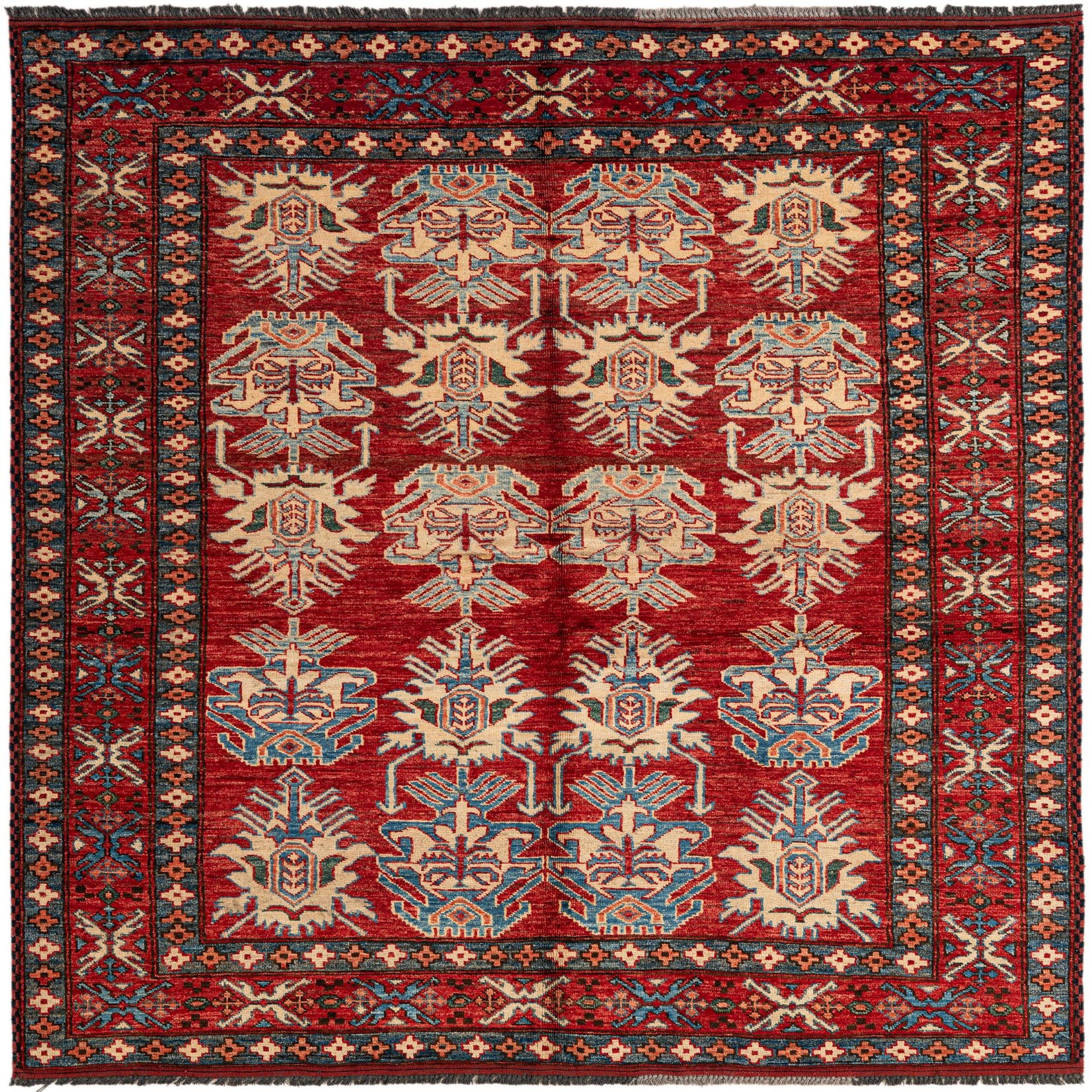 A 5x7 rectangular red wool rug with a modern oriental pattern in cream and blue, featuring intricate motifs and a contrasting border.