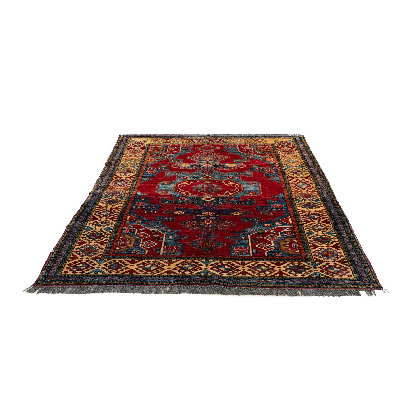 A 5x7 rectangular Kazak wool rug featuring a vibrant red field with a central blue medallion and intricate oriental patterns, framed by a golden border.