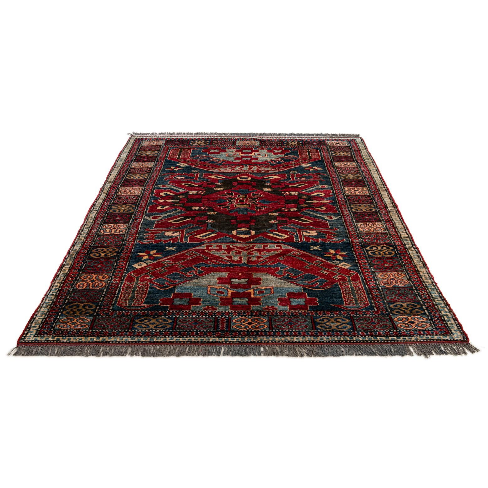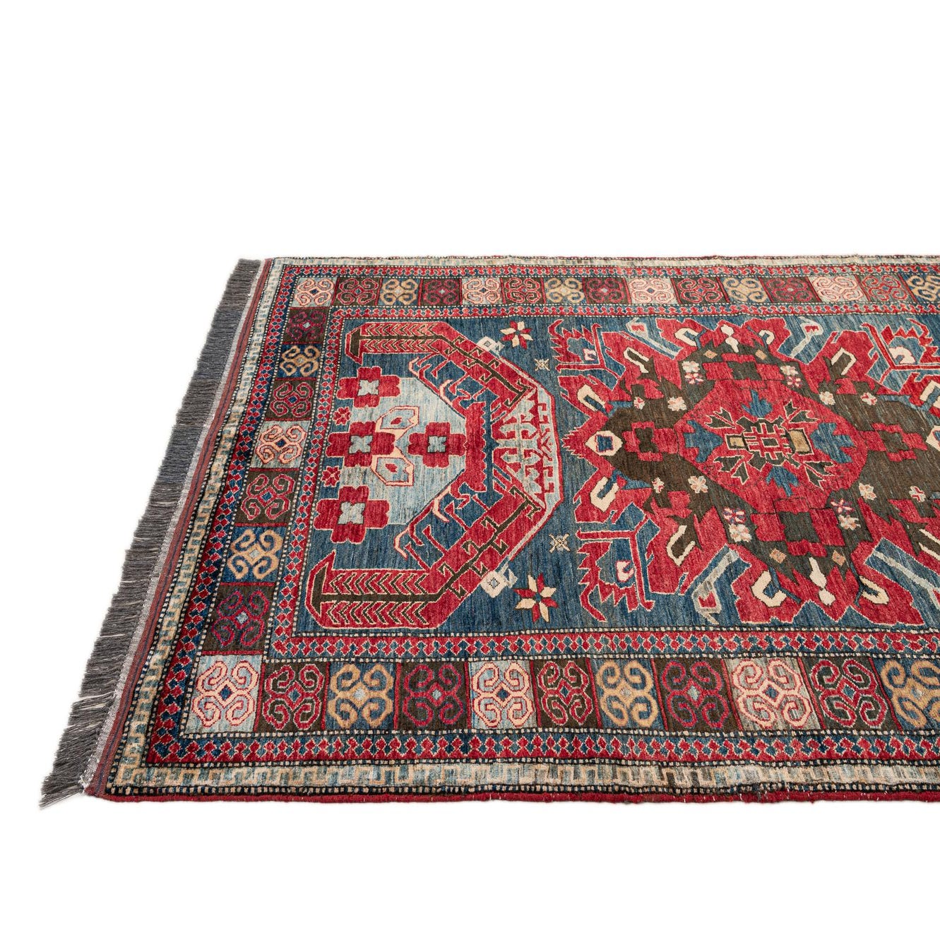 A 5x7 rectangular Rugs.com Kazak rug with a dominant red and blue modern Oriental pattern, featuring intricate geometric motifs and a flat pile.