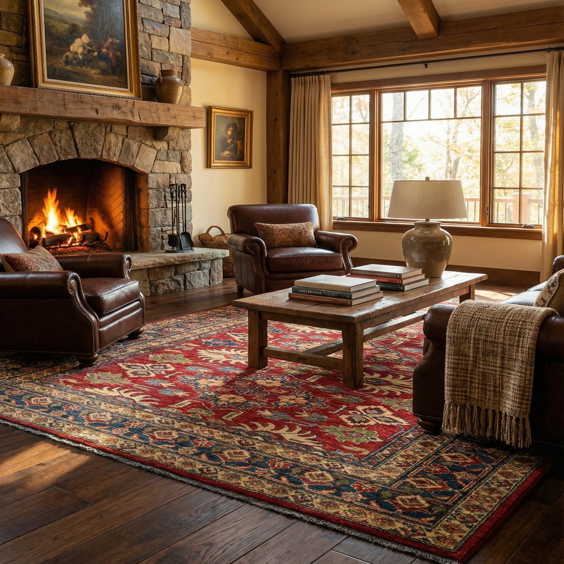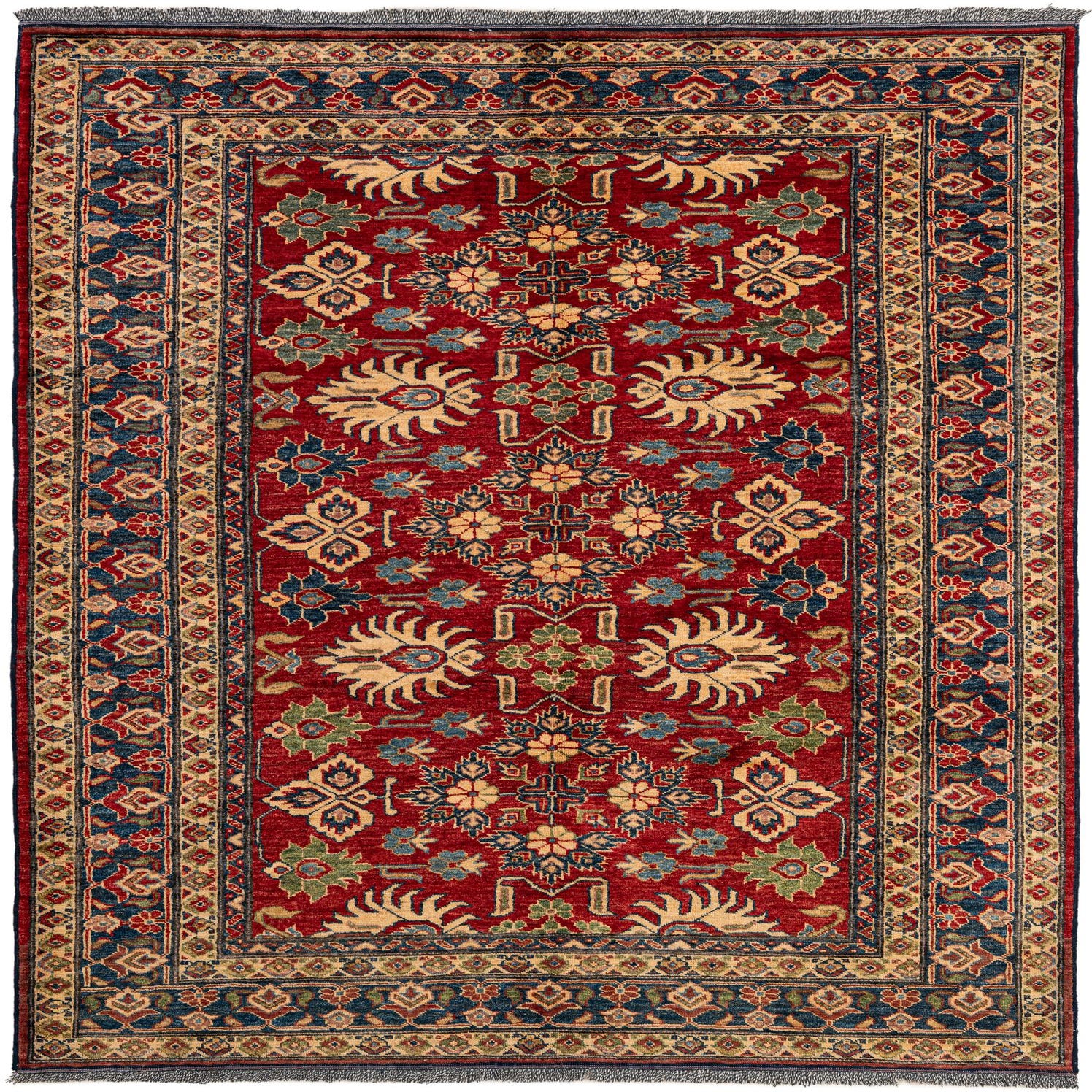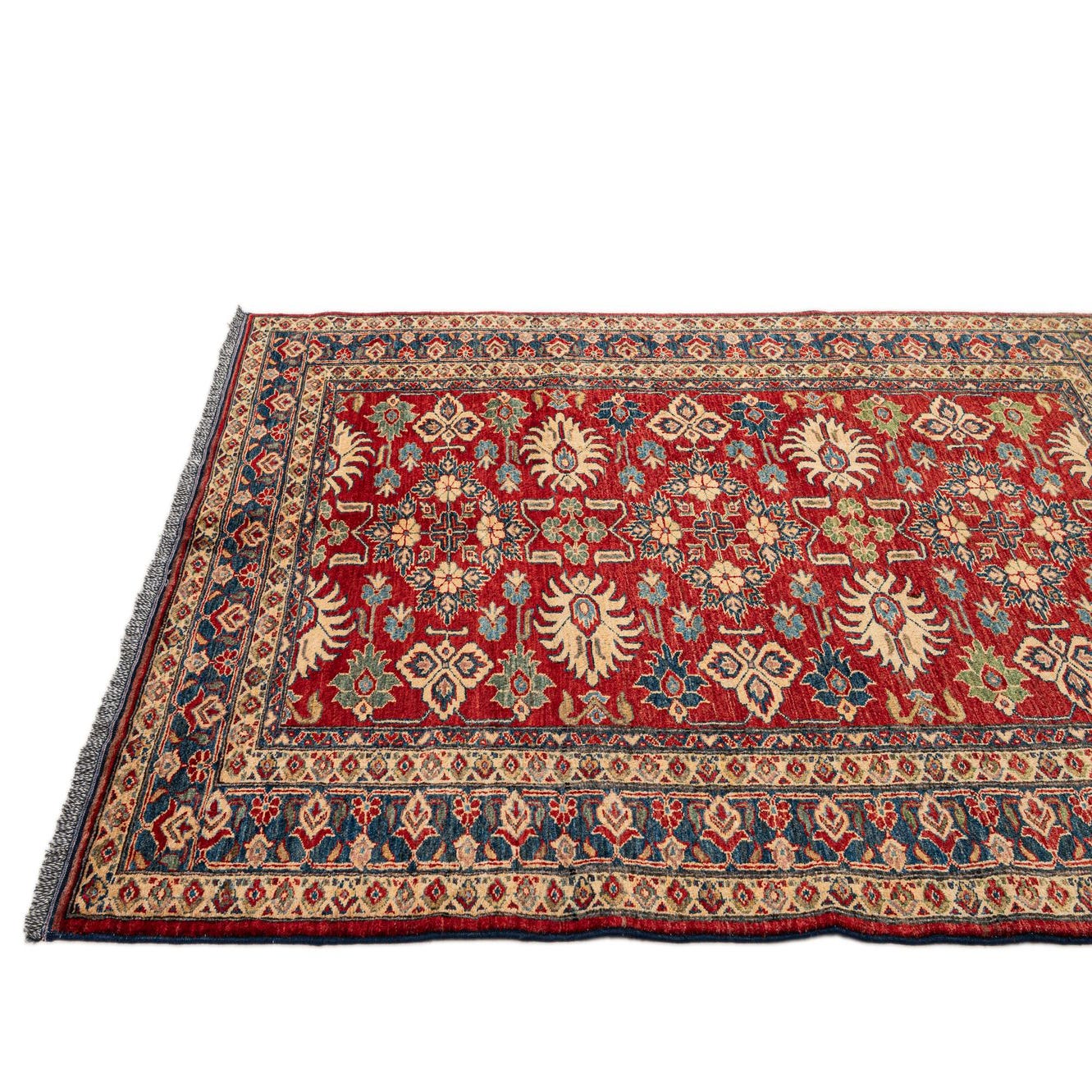 A 5x7 rectangular Rugs.com Kazak rug with a deep red field and intricate oriental patterns in blue, gold, and green.