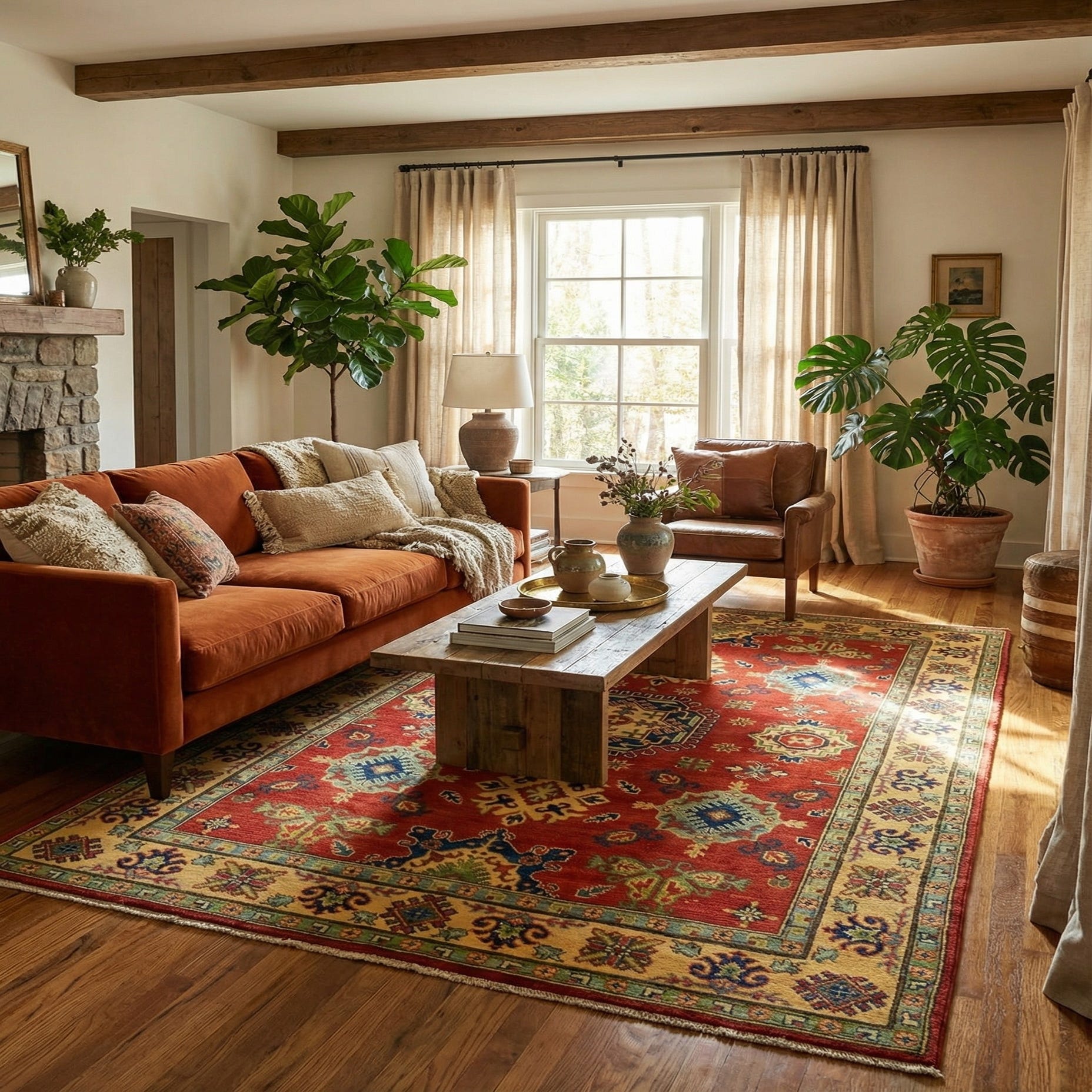 This rug's bold pattern and rich colors make it a statement piece in any room. It would sit well in traditional, bohemian, and eclectic interiors, anchoring furniture in a living room, dining room, or study. It can also serve as a primary color inspiration for a space, allowing for harmonious decor selections that resonate with its dynamic and storied aesthetic.