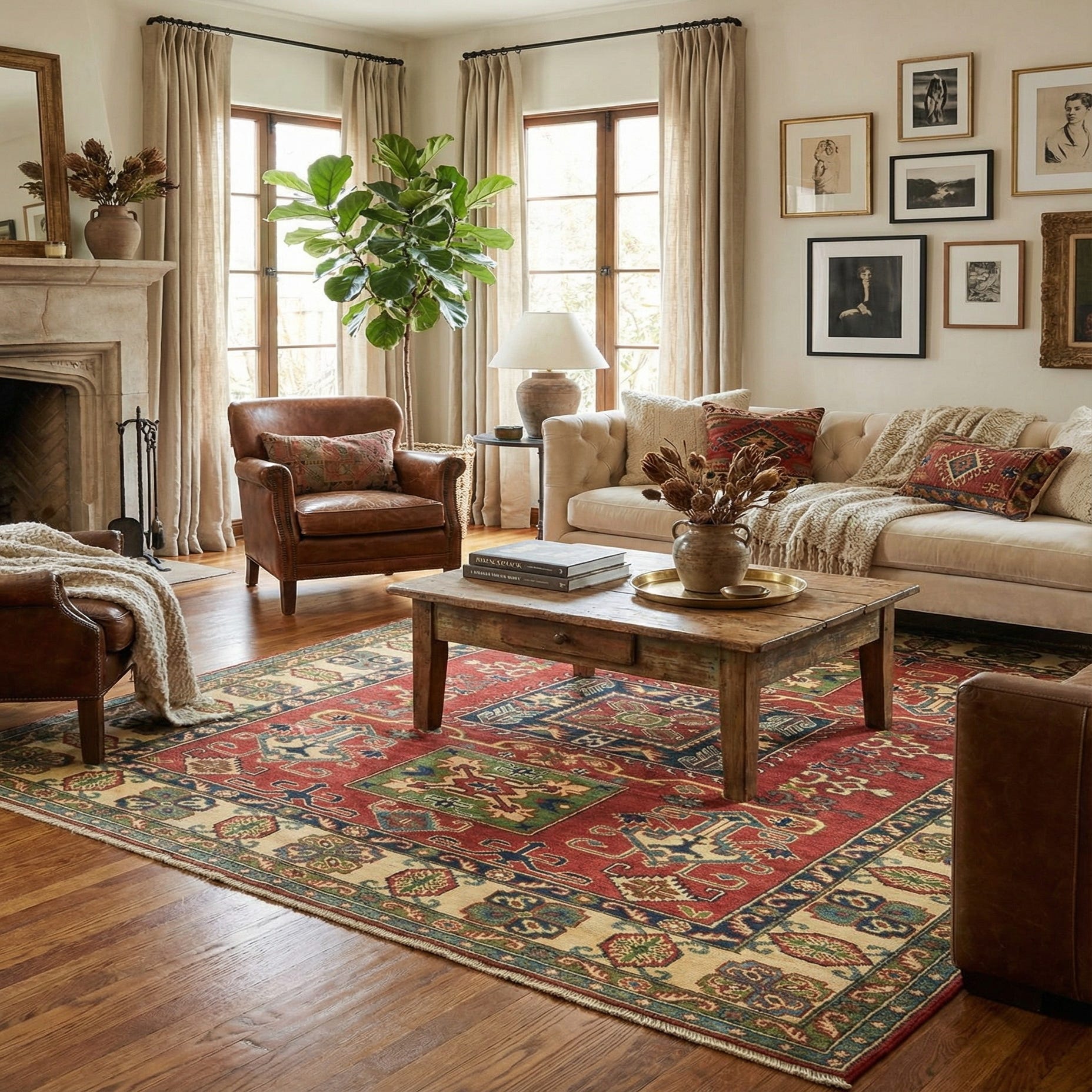 A 5x7 rectangular Rugs.com Kazak rug with a red field and a cream border, featuring intricate tribal and oriental patterns in green, blue, and gold.