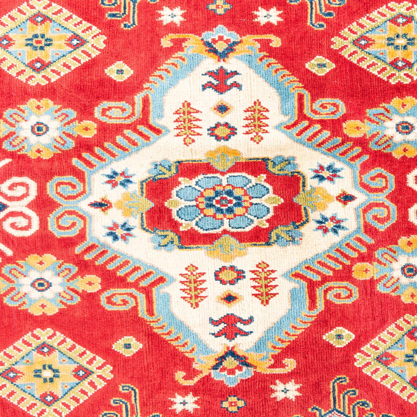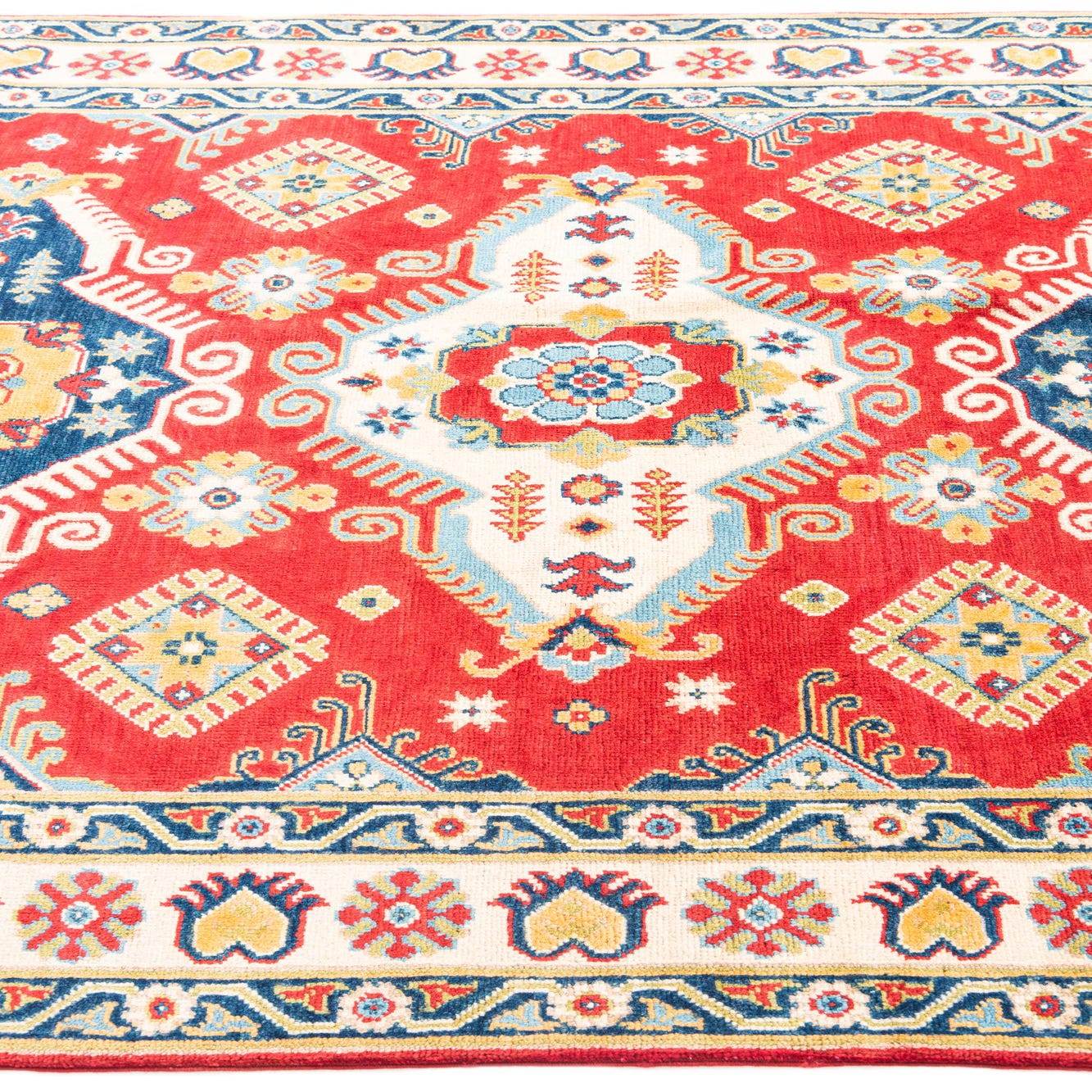 A 5x7 rectangular Rugs.com Kazak rug with a vibrant red field, featuring a central medallion and intricate traditional patterns in navy, cream, and gold.