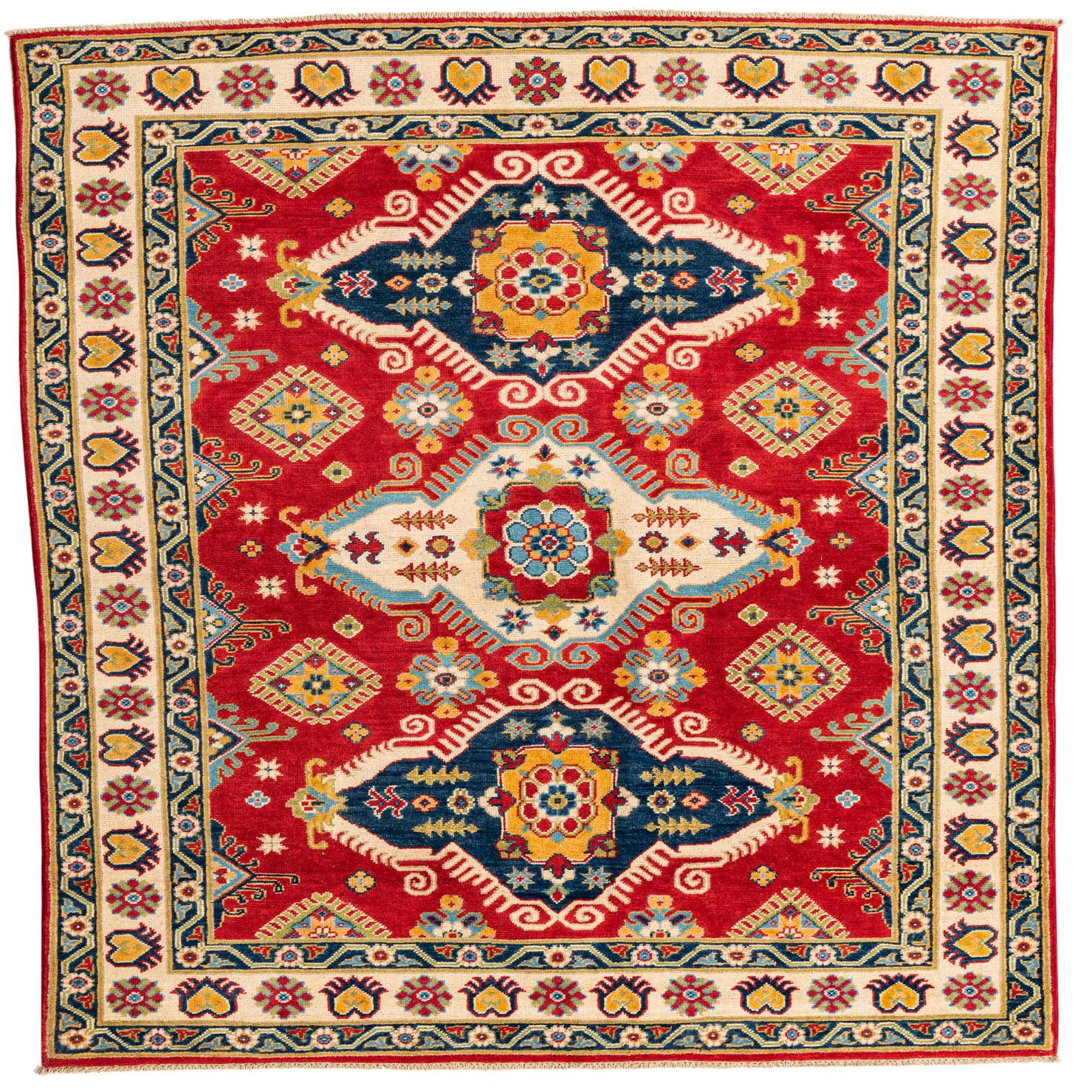 This Kazak collection rug is a hand-knotted piece measuring 5x7 feet, crafted from 100% hand-spun wool for a notably robust texture. The rug is adorned with a vibrant red background, complemented by an intricate pattern featuring hues of gold, ivory, navy blue, and green. The traditional design includes geometric forms and stylized botanical motifs that are characteristic of heritage Kazak patterns. Detailed border work frames the central composition, providing a sense of structure and harmony to the overall design.