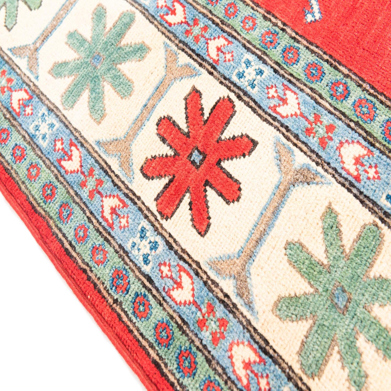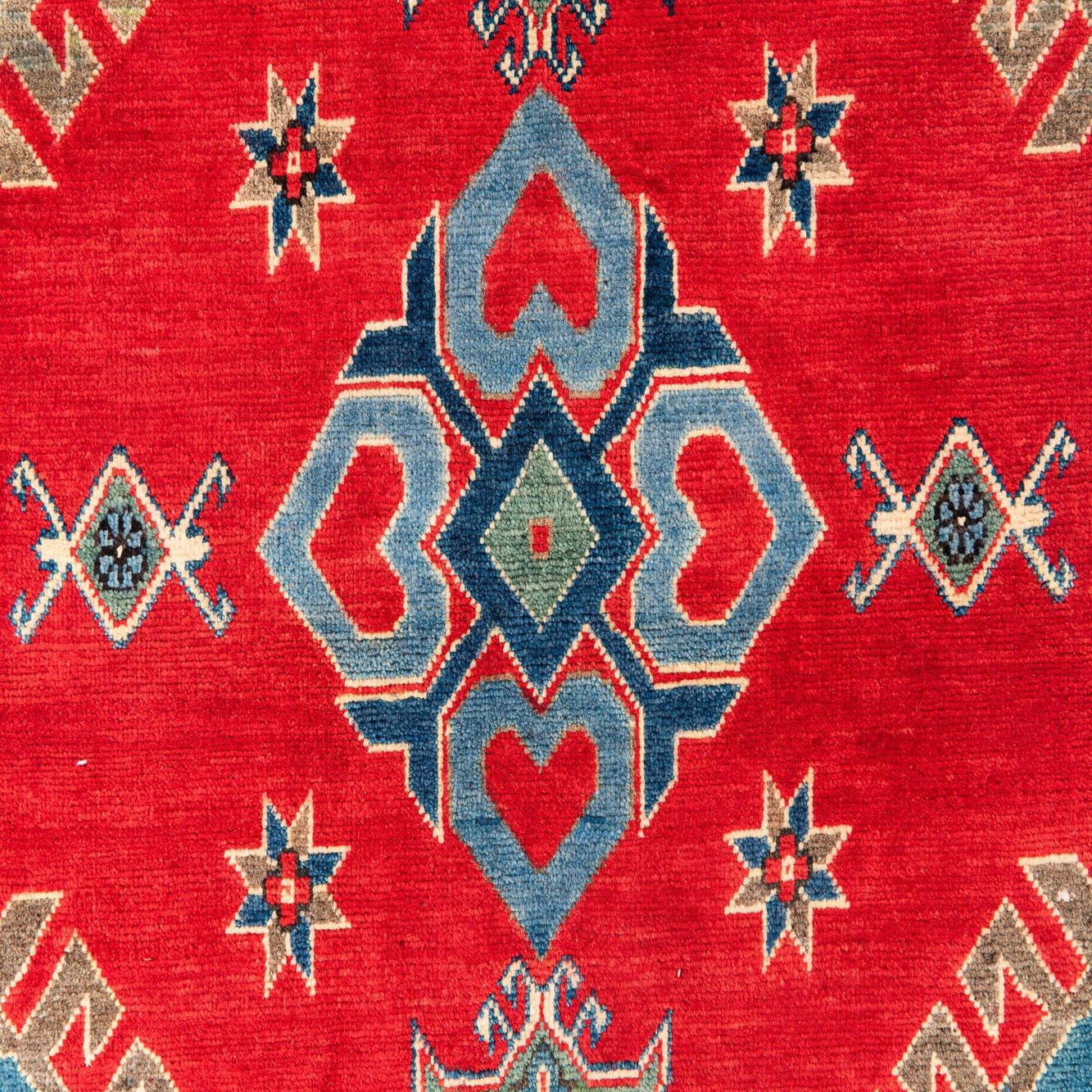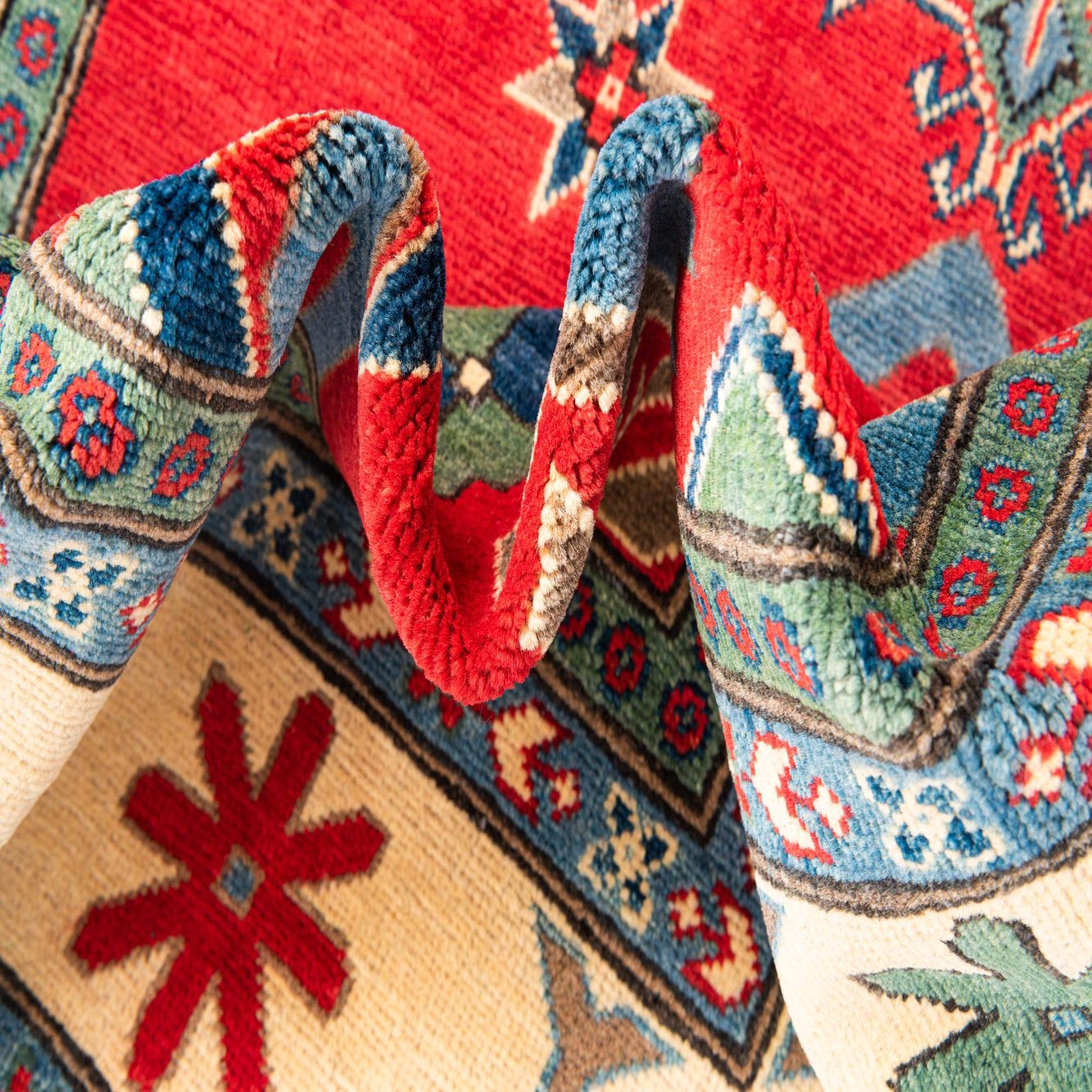 The Kazak collection showcases a 5x7 hand-knotted rug crafted from 100% hand-spun wool, offering a resilient and plush texture that is designed to endure high traffic areas while providing a comfortable underfoot experience. This rug features a vibrant red background, with a geometric and symbolic pattern that draws inspiration from traditional tribal designs, incorporating a harmonious blend of colors, including shades of blue, navy blue, green, brown, and cream.