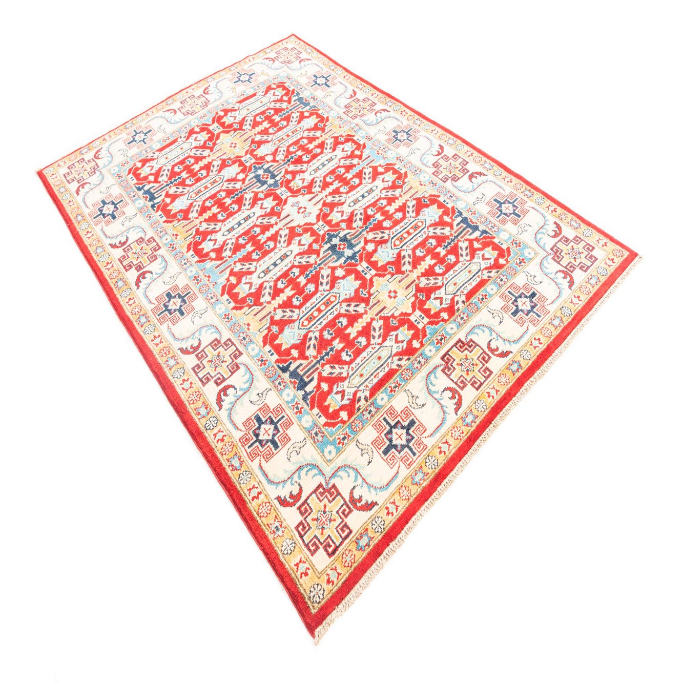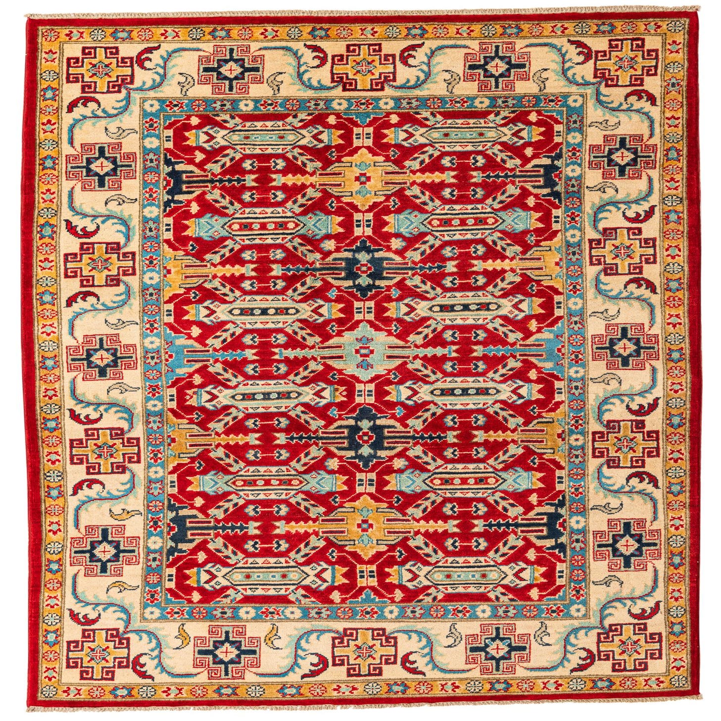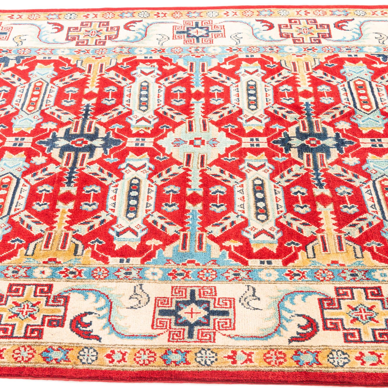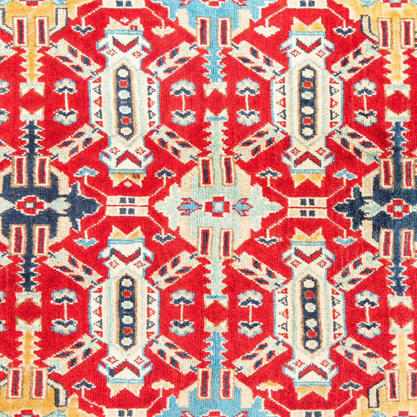 The Kazak collection offers a 5x7 hand-knotted rug crafted from 100% hand-spun wool, presenting a richly textured and durable piece. The rug features a vibrant red background complemented by an intricate pattern that includes hues of light blue, navy blue, yellow, and green. Traditional geometric motifs and borders create a sense of structure and continuity, while the inclusion of fringe adds a classic touch.