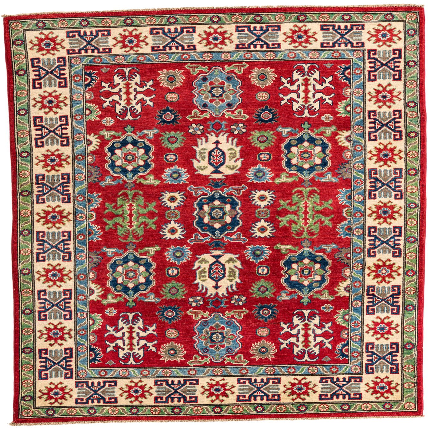 The Kazak Collection presents a 5x7 hand-knotted rug crafted from 100% hand-spun wool, offering durability, comfort, and a sumptuous feel underfoot. This rug showcases a vibrant red background accentuated by a traditional geometric pattern intricately woven in shades of blue, brown, cream, navy blue, and green. The design includes a central medallion surrounded by symbolic motifs that render a sense of time-honored craftsmanship. The pattern's precision and clarity are a testament to the skilled artisans who have created this piece.