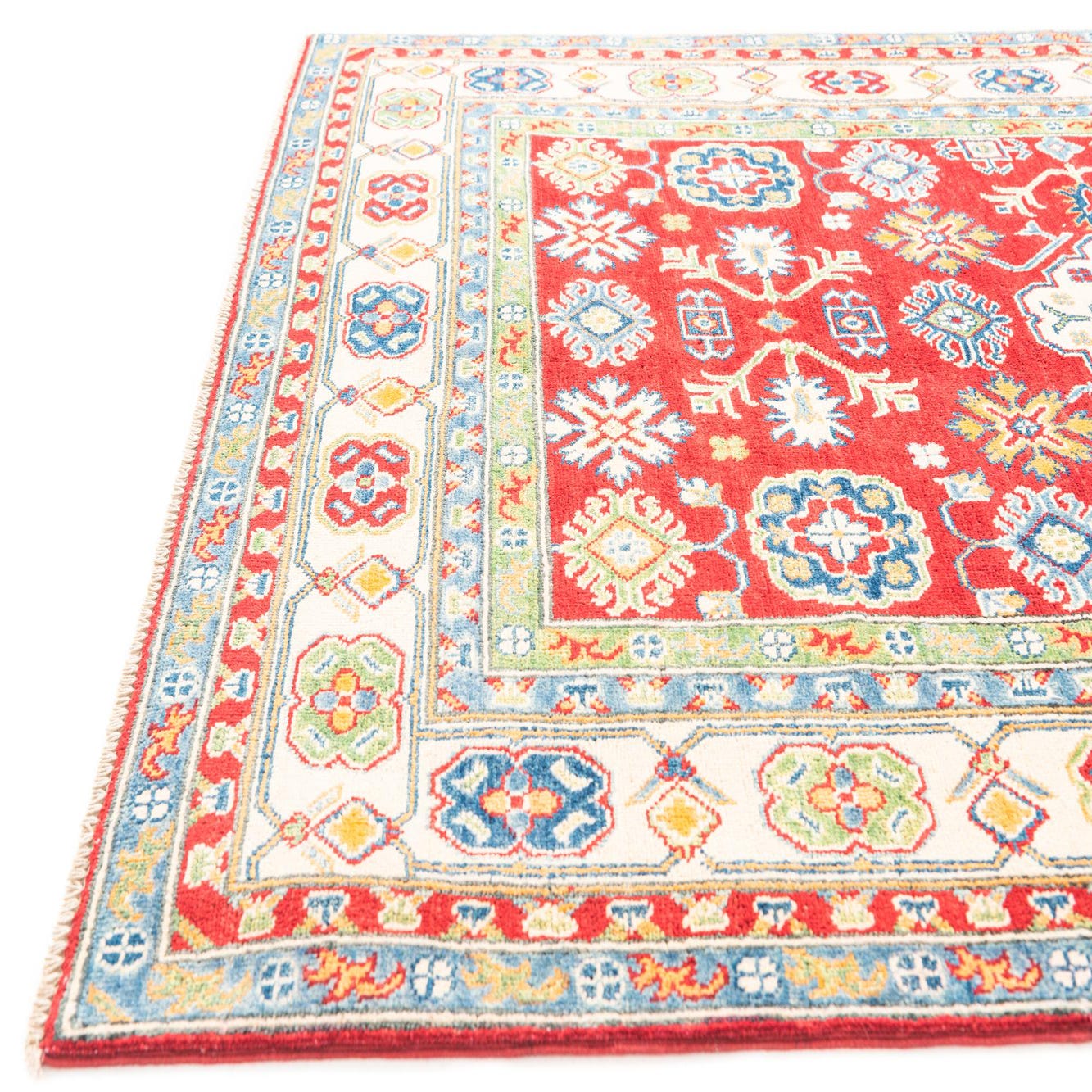 A 5x7 rectangular Rugs.com Kazak rug with a vibrant red field and intricate traditional medallion patterns in blue, gold, and ivory.