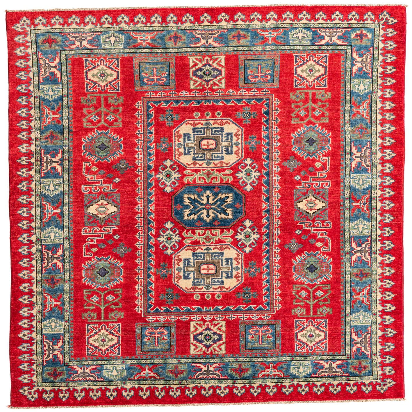 A 5x7 rectangular red traditional Kazak rug with intricate blue, cream, and green geometric patterns.