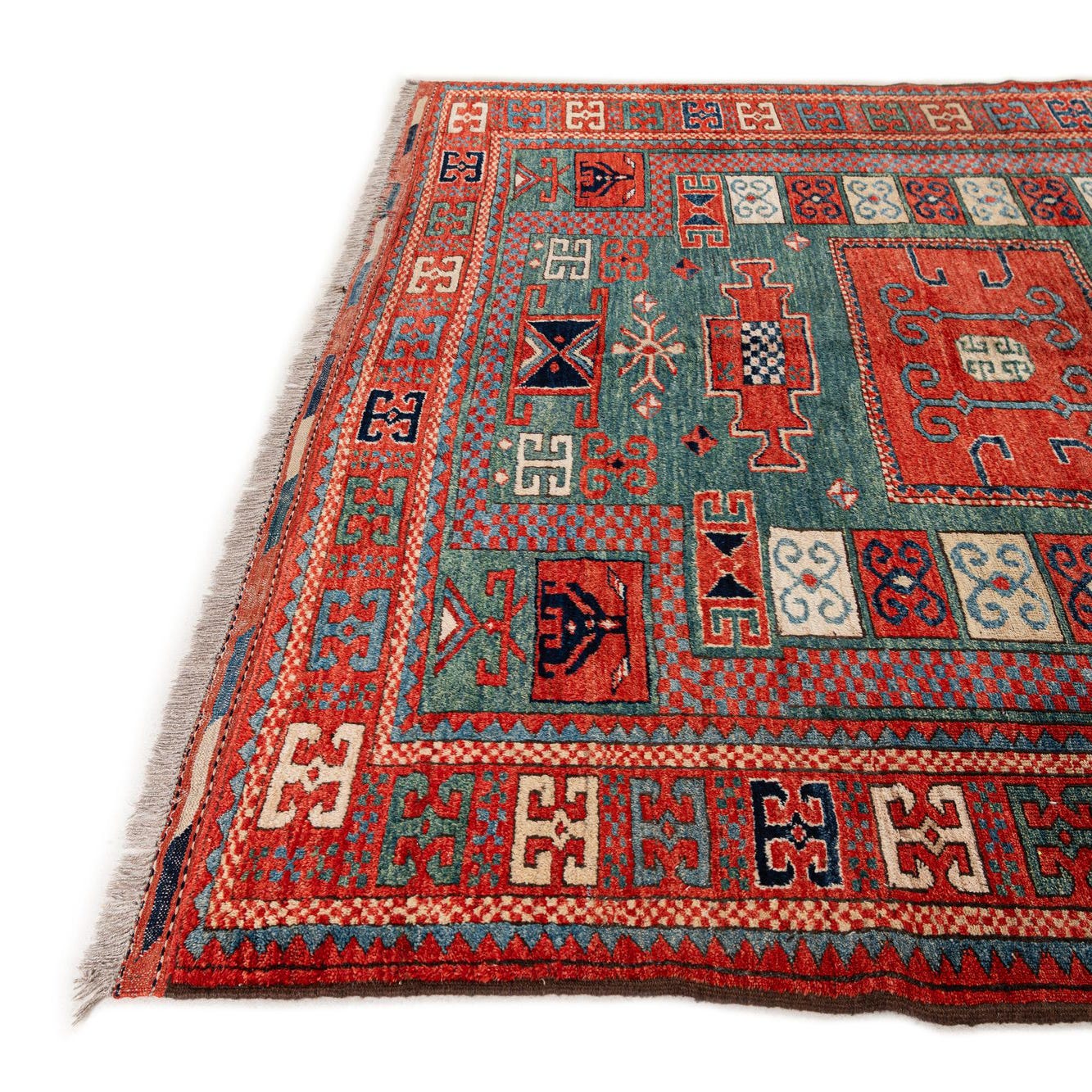 A 5x7 rectangular traditional Kazak rug featuring a central red medallion on a teal field with intricate red, blue, and cream geometric patterns and a red border.