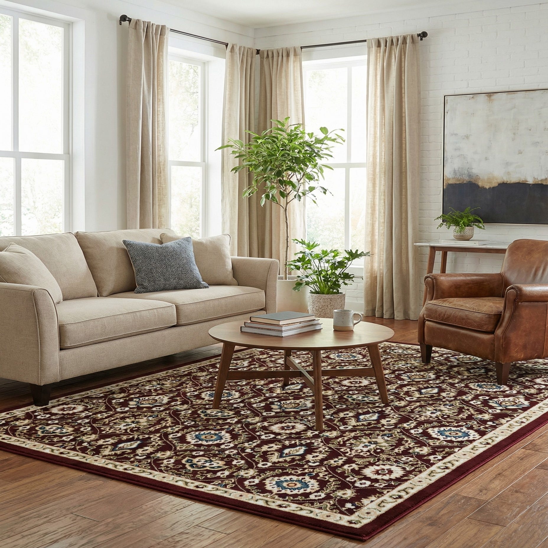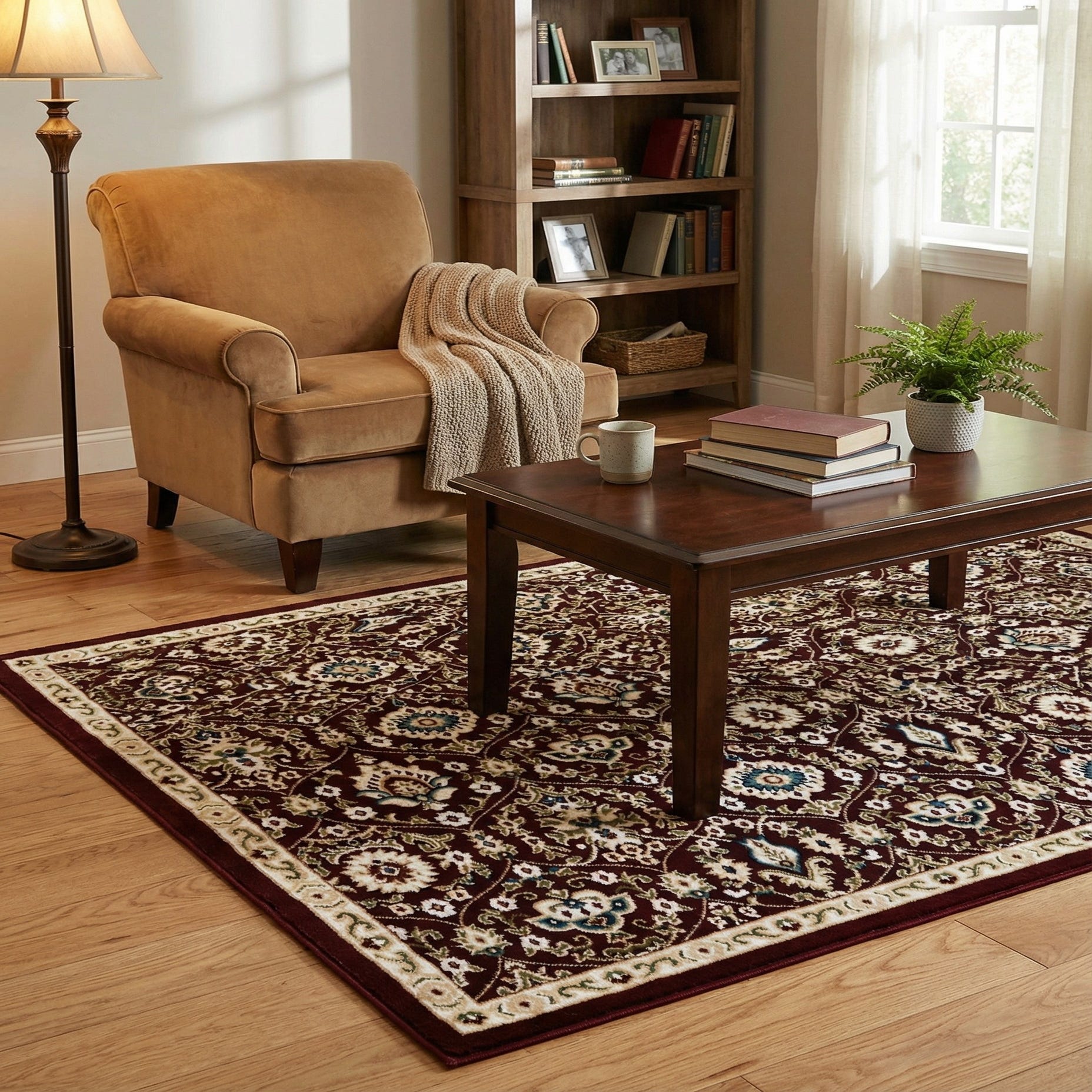 A 5x7 rectangular indoor rug with a deep red background and an intricate floral pattern in cream, light blue, and green.