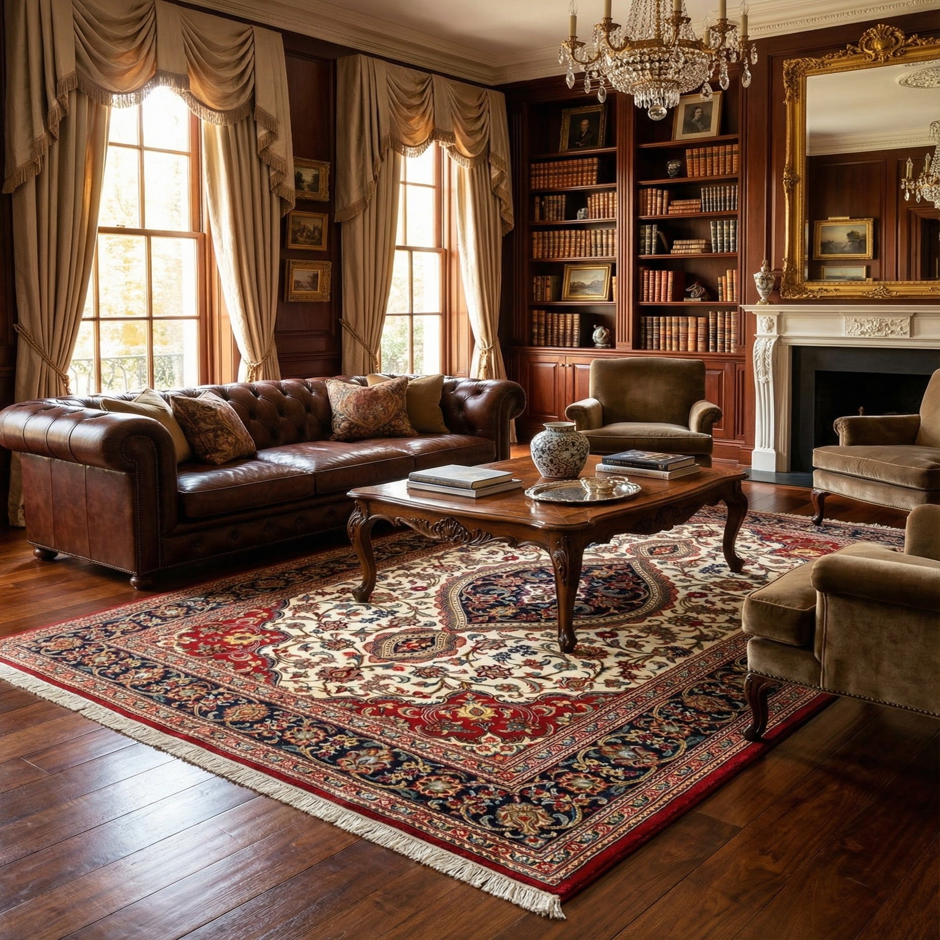 A 5x7 rectangular Persian rug with a cream field, red border, and intricate floral medallion in navy and red.