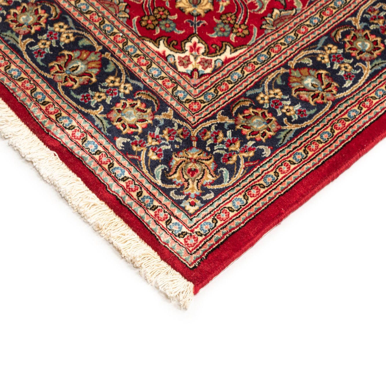 This Ghom collection rug is a hand-made wool piece, sized at a versatile 4x6, ideal for a variety of spaces. The rug features a vibrant red background, imbued with an intricate pattern that includes a dynamic array of accent colors such as navy, beige, and hints of green and gold. Comprised of a dense central medallion flanked by ornate corner brackets and an elaborate border, the design exudes a classic elegance.