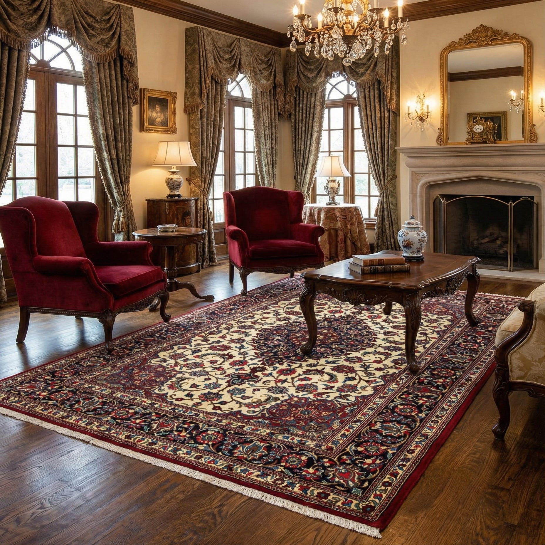 This Ghom rug's rich color scheme and elaborate design make it an ideal addition to interiors that feature classic, traditional, or even eclectic decor elements. It would serve well as a centerpiece in a formal living room, under a dining table, or as a sophisticated accent in a home office, where it can anchor the furniture and enhance the room's decor.