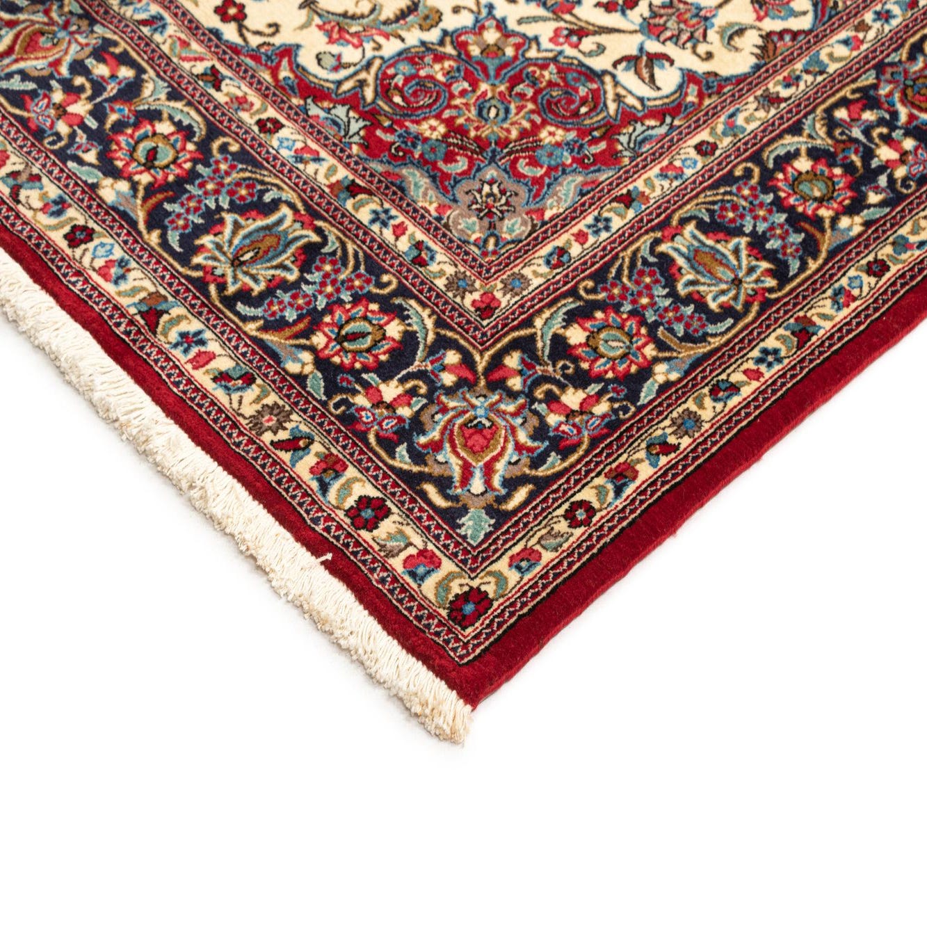 The Ghom collection presents a 4x6 hand-made wool rug featuring a traditional and intricate pattern that infuses a sense of elegance and time-honored craftsmanship into any space. The background color is a vibrant red, creating a warm and inviting atmosphere. This rug is adorned with an array of detailed floral and botanical motifs, gracefully blending shades of navy, cream, gold, and hints of green, which offer visual depth and a sophisticated palette.