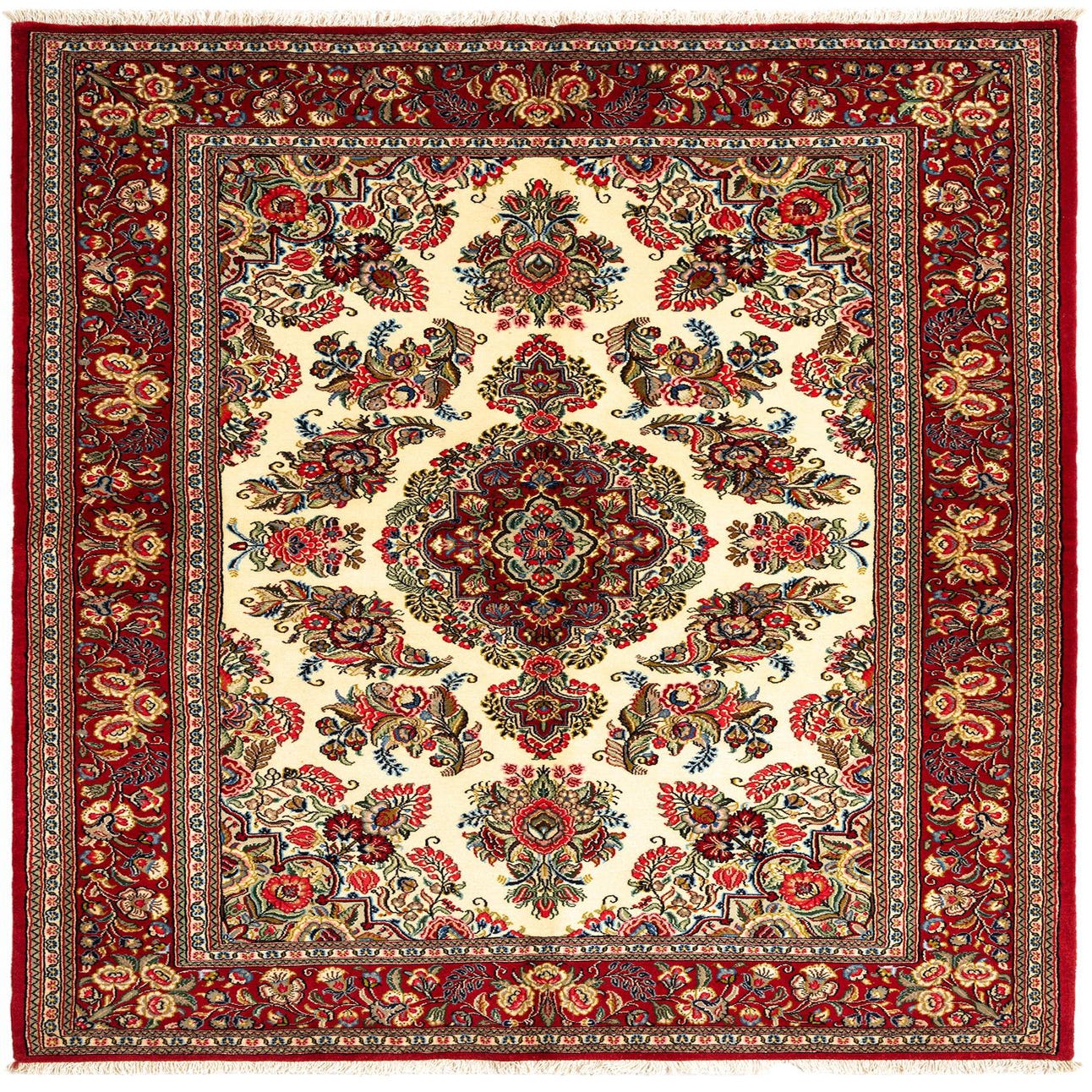A 5x7 rectangular Persian rug with a cream center medallion and red border, featuring intricate floral patterns.