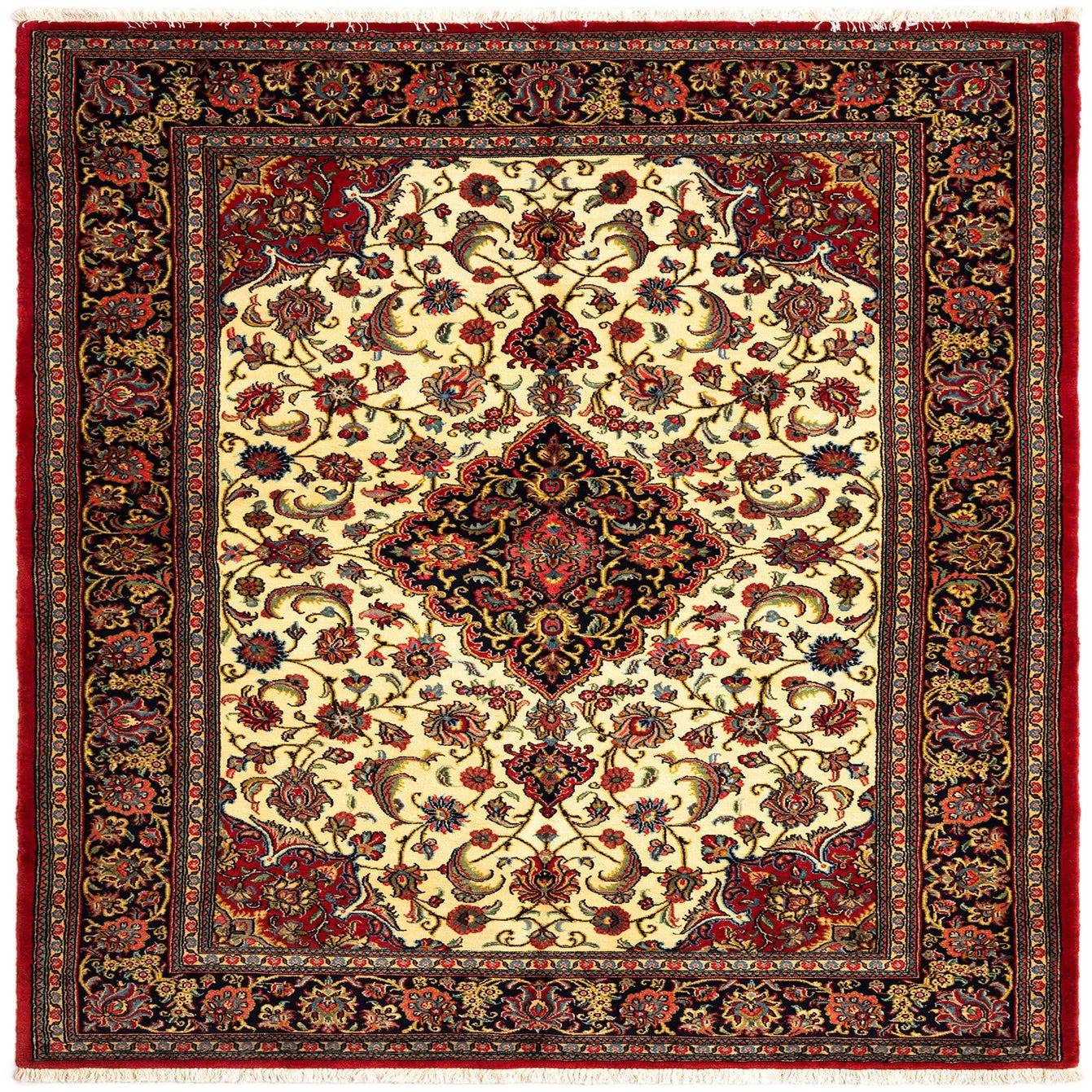 A 5x7 rectangular Persian rug with a cream field, red borders, and intricate floral and medallion patterns in red, black, and gold.