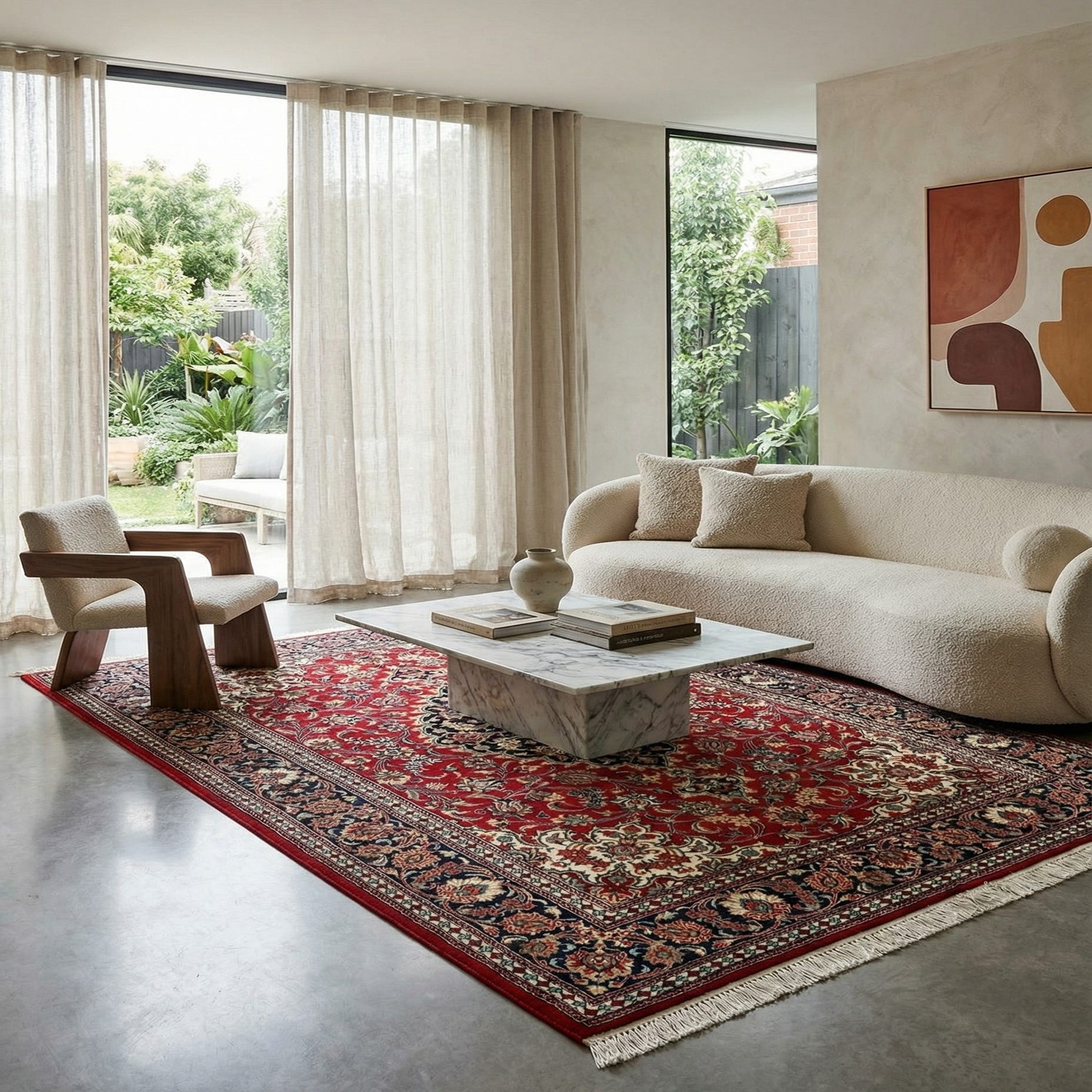 This rug is ideally suited for a traditional living room or as a sophisticated focal point in a formal dining area. Its luxurious feel and detailed pattern would also be well-placed in an office or library, where it can complement wood furniture and classic design elements. The Ghom rug anchors any room with its stately charm and is an enduring choice for those seeking to create an atmosphere of refined comfort.
