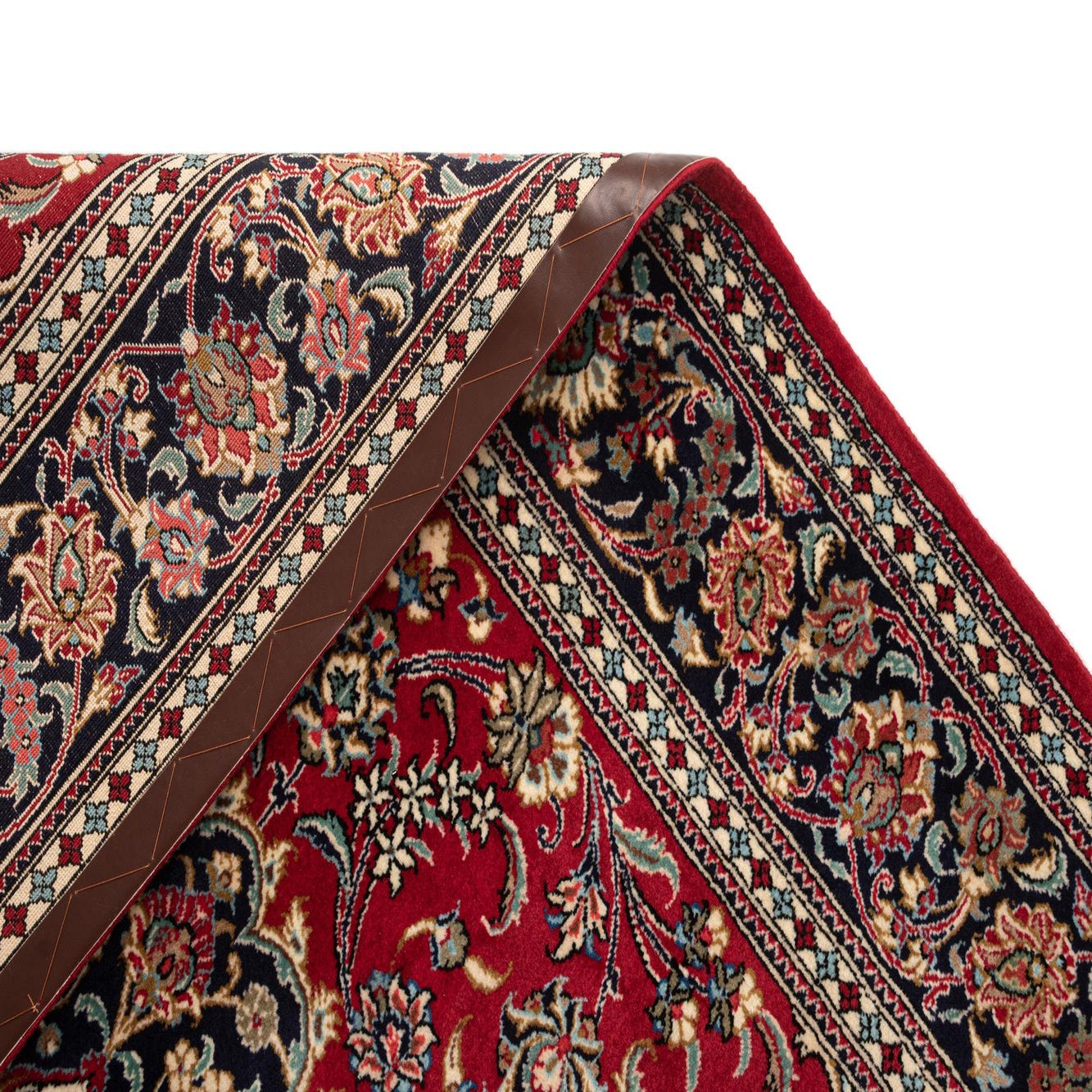 This Ghom collection rug, handcrafted from wool, boasts a size of 4x6 and comes alive with a rich, red background that serves as the canvas for its ornate pattern. Intricate floral and foliate motifs in a symphony of navy, beige, and complementary hues create a stunning central medallion and border display, manifesting a timeless elegance.