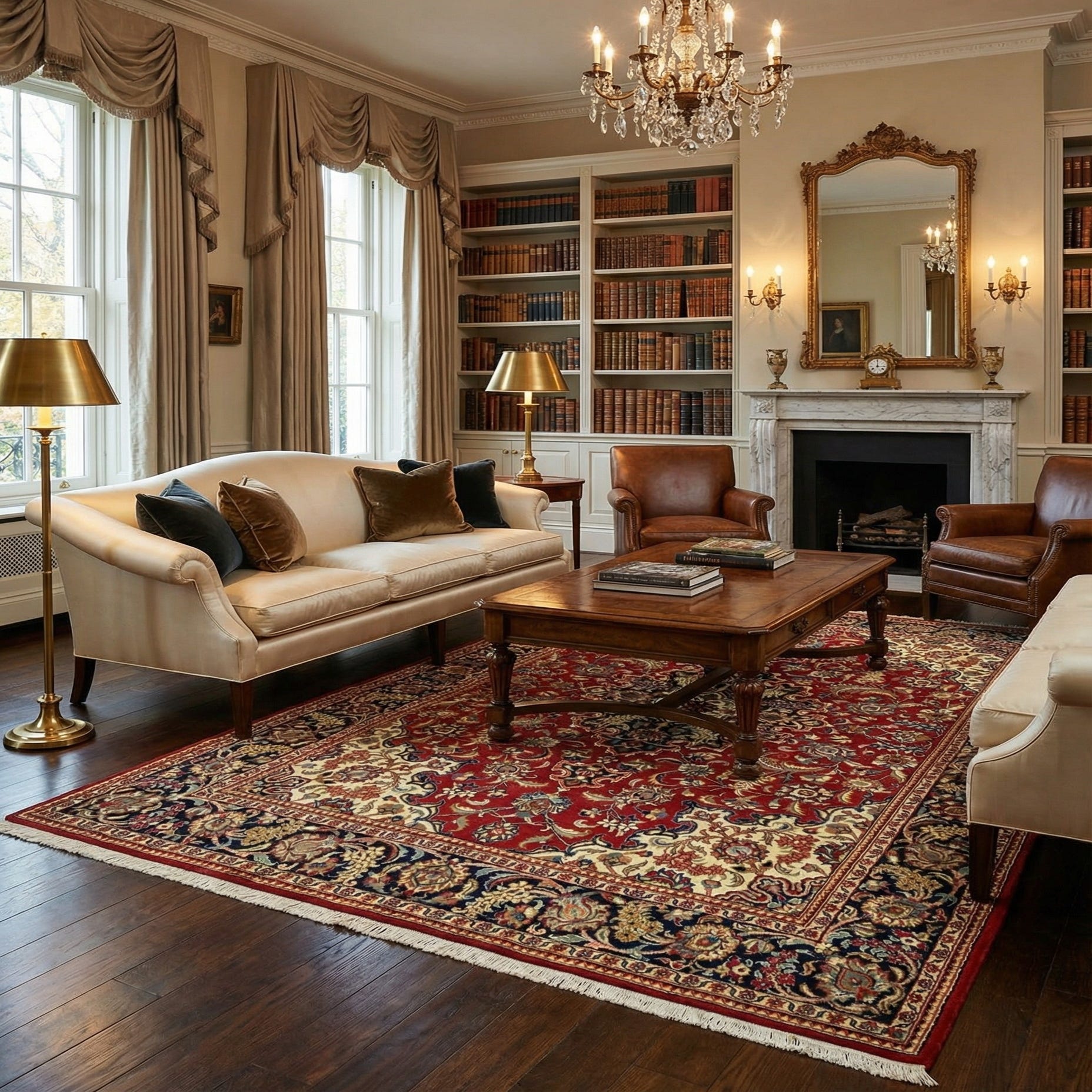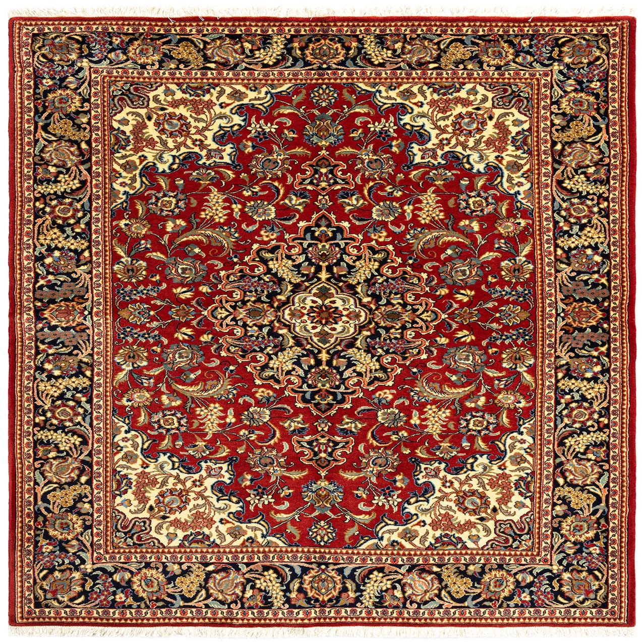 A 5x7 rectangular red Persian rug with intricate floral and medallion patterns in cream, navy, and gold.